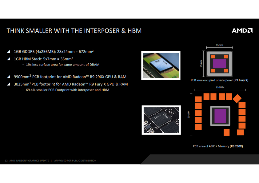 ซึ่งในสถาปัตย์ Hawaii จะต้องใช้เม็ดแรมมากถึง 16ตัวติดลงบนตัวการ์ดทำให้พื้นที่หรือขนาดของการ์ดนั้นใหญ่ตามไปด้วยนั่นเองครับ แต่สำหรับ HBM นั้น พื้นที่ของเม็ดแรมทั้ง 4ตัวจะอยู่ในรอบๆ GPU ทำให้ขนาดของการ์ดนั้นเล็กลงแต่ประสิทธิภาพนั้นเพิ่มขึ้นอย่างมากเลยทีเดียว