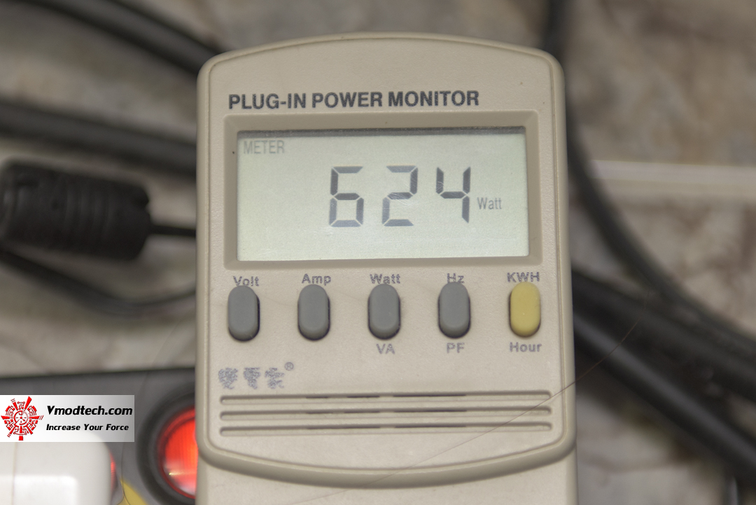 และเมื่อตรวจสอบกำลังไฟที่ระบบเรียกจากเต้ารับนั้นจะเห็นว่าพุ่งไปมาและสูงสุดที่ประมาณ 615-625 วัตต์ครับ