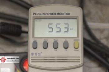 ในขณะ Full Load นั้น ระบบรวมทั้งหมดจะกินไฟจากเต้ารับที่ประมาณ 550 วัตต์ครับ ตรงนี้ต้องบอกว่าตัวเลขนั้นสูงเอาเรื่อง โดยที่ไฟนี้จะสามารถเทียบกับการรีวิวกราฟฟิกการ์ดตัวอื่นได้ครับเพราะเป็นชุดทดสอบเดียวกันบน platform 2011-3