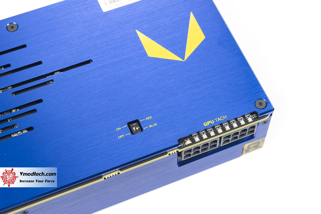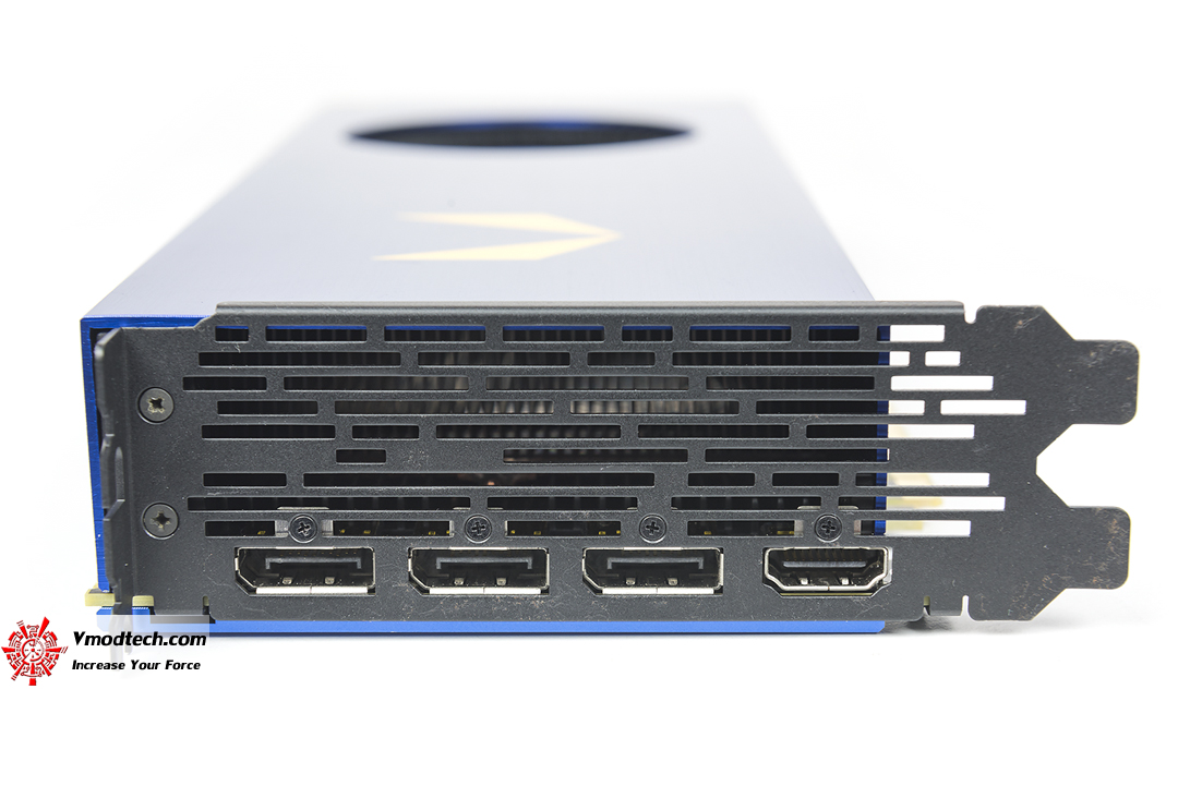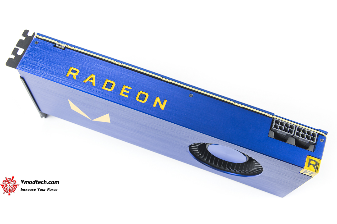สันการ์ดนั้นจะมีโลโก้ RADEON อยู่ รวมถึงจะมีโลโก้ตัว R ที่มุดการ์ดด้านขวาล่างของรูป ซึ่งจะมีแสง LED เปล่งออกมาเมื่อเสียบใช้งาน ความต้องการใช้ไฟของ VEGA Frontier นั้นต้องการหัวแบบ PCIe 8 พินจำนวนสองหัวครับ