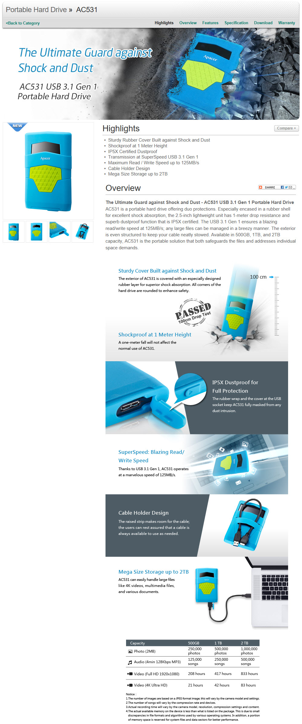 สวัสดีครับ วันนี้เรามาชมรีวิวอุปกรณ์จัดเก็บแบบพกพาที่น่าจะเป็นสิ่งจำเป็นสิ่งนึงสำหรับหลายๆท่านครับ HDD แบบพกพานั้นถือเป็นอุปกรณ์จัดเก็บที่ยังเป็นที่แพร่หลายอยู่ในปัจจุบัน อันเนื่องมาจากความจุเมื่อเทียบกับราคานั้นยังเหมาะสมรวมถึงการเชื่อมต่อนั้นยังรองรับการทำงานครอบคลุมในวงกว้างกว่าด้วยครับ APACER AC531 นั้นเป็น Portable HDD หรือว่าเป็น HDD แบบมีกล่องรุ่นนึงครับ ซึ่งซีรีย์นี้นั้นได้ถูกออกแบบให้เป็น HDD แบบพกพาที่สามารถกันกระแทกได้ซึ่งเค้าแจ้งไว้บนกล่องว่าสามารถตกจากที่สูงได้สูง 1 เมตรโดยไม่เสียหายรวมถึงสามารถกันฝุ่นได้ดีด้วย สำหรับวันนี้หยิบเอา APACER AC531 Portable HDD 1.0TB USB 3.1 Gen 1 มาทำการรีวิวให้ได้ชมกันครับ รายละเอียดต่างๆก็ตามมาเลย