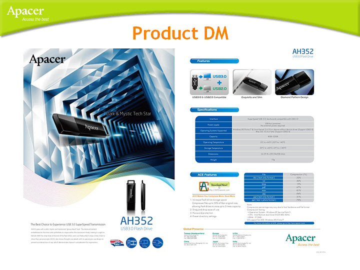 สวัสดีครับ ช่วงต้นสัปดากันอีกครั้งนึงก็เตรียมตัวกลับไปทำภาระกิจการงานกันเหมือนเดิม วันนี้มี USB Flash Drive อีกตัวนึงที่ยังค้างอยู่ครับ ซึ่งก็ยังเป็น product จาก Apacer ที่คุ้นเคยของเรานั่นเอง วันนี้จะเป็น AH352 ซึ่งเป็น USB Flash Drive 3.0 ขนาดและดีไซน์สวยงามควรคู่กับคุณผู้หญิงเลย รับชมรายละเอียดของ Apacer กันก่อน