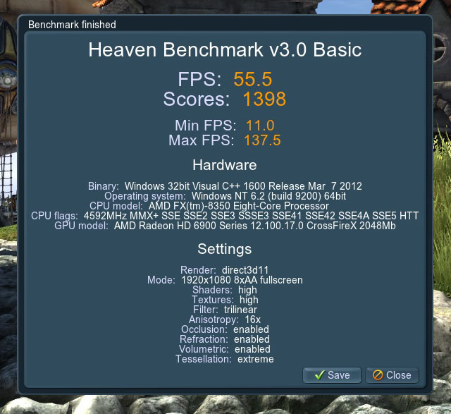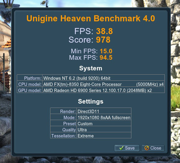 มาดูชุดทดสอบใหม่จาก Unigine Heaven 4.0 กันบ้างครับซึ่งกินสเปคมากกว่าเดิมอลังการกว่าเดิม แต่ AMD FX-8350 และ ASRock 990FX Extreme9 ก็สามารถพาการืดจอสองตัวทำงานได้อย่างลื่นไหลที่เฟรมเรต 3.8เฟรมเรตกันเลยทีเดียวครับ ลื่นจริงๆ AMD อิอิ