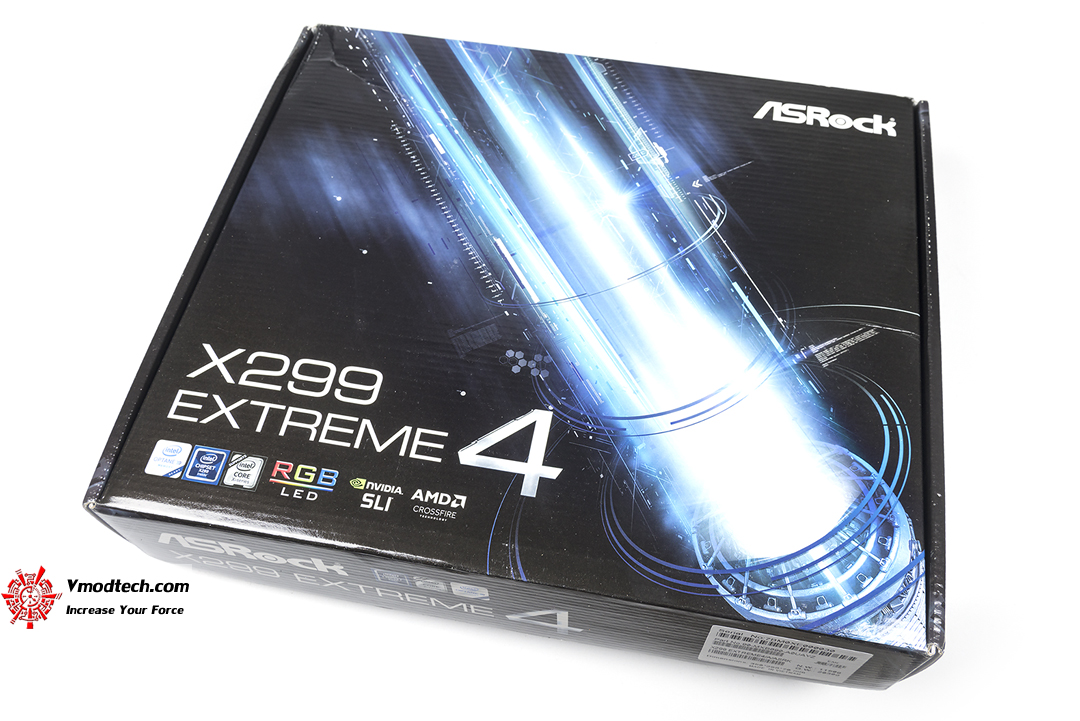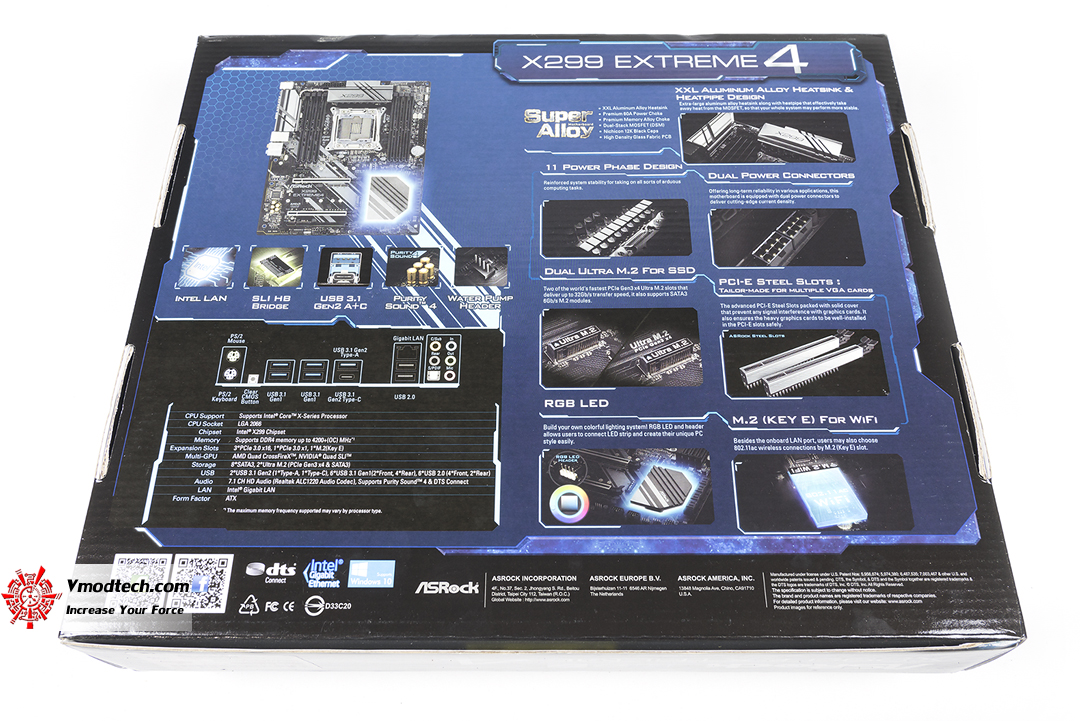 กล่องบรรจุ ASROCK X299 Extreme 4 นั้นจะมีขนาดไม่ใหญ่มากนะครับ สีสรรออกแบบมาด้วยโทนสีดำตัดกับสีน้ำเงินแลดูเข้มขรึม ทั้งด้านหล้าและด้านหลังกล่องมีการนำเสนอรายละเอียดของบอร์ดเอาไว้เยอะและครอบคลุมคุณสมบัติเด่นของบอร์ดนี้อย่างครบถ้วน