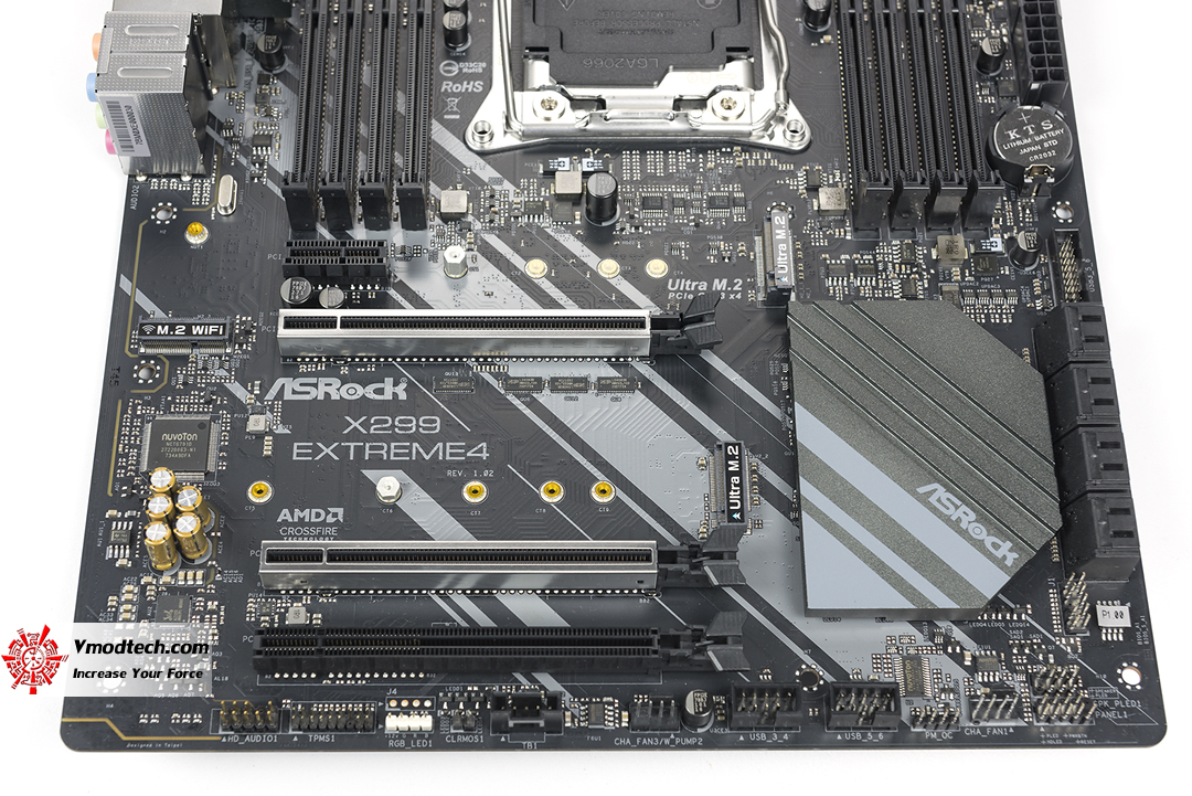 บริเวณสล๊อด PCIe ครับ รองรับ 2-Way CrossFire/2-Way SLI Support และบริเวณนี้จะเห็นพอร์ทการเชื่อมต่อแบบ M.2 ซึ่งมีมาให้สองช่องนะครับ ถ้าติดตั้ง CPU เบอร์เล็กที่มีแค่ 16 เลน ถ้า SLI/CrossFire จะเห็นแค่ 8+8 X นะครับ ต้องพิจารณาในจุดนี้ด้วย