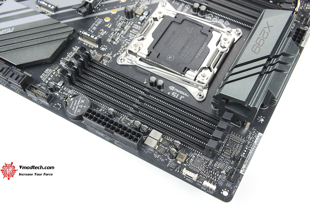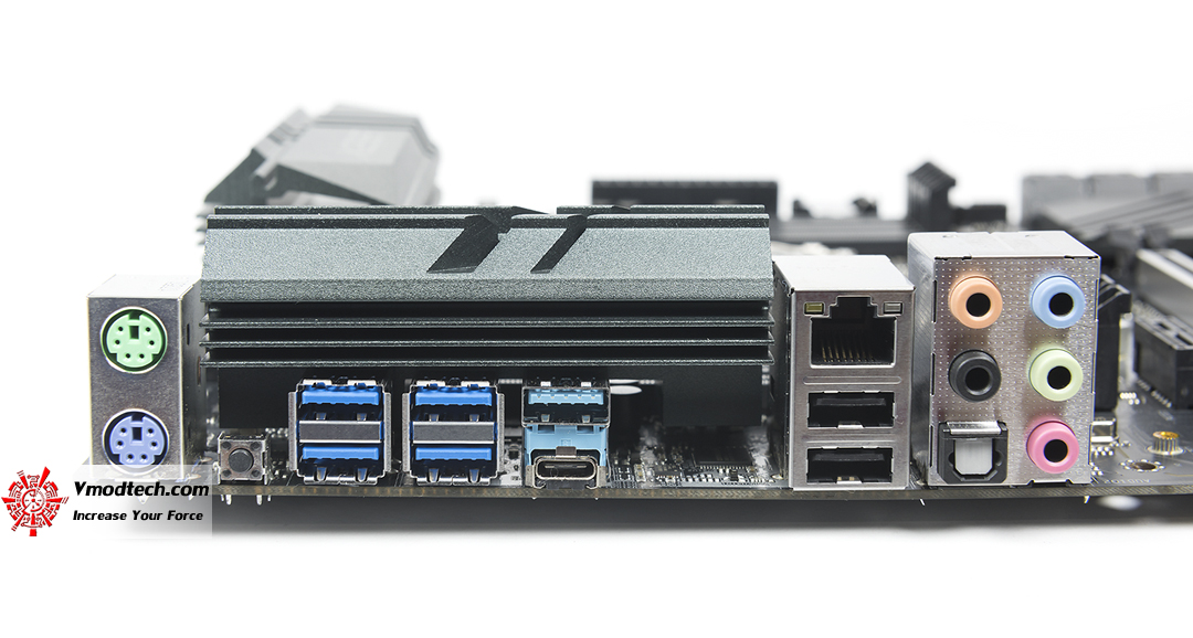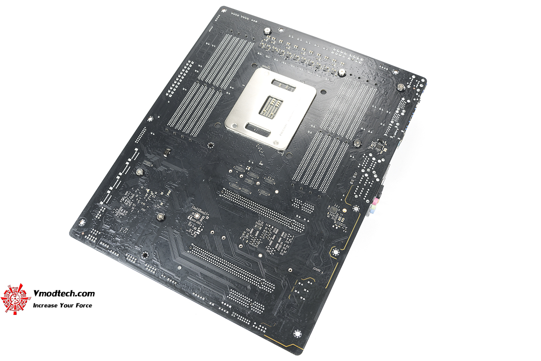 ด้านบนของบอร์ดจะเป็นที่เสียบไฟเลี้ยง CPU แบบแปดพินสองหัวครับ ฝาครอบพอร์ทเชื่อมต่อด้านหลังและที่บนภาคจ่ายไฟแบบ 11 เฟสนั้นเป็นอลูมิเนียมลัลลอยที่มีความสามารถในการนำพาความร้อนและระบายออกได้อย่างรวดเร็ว