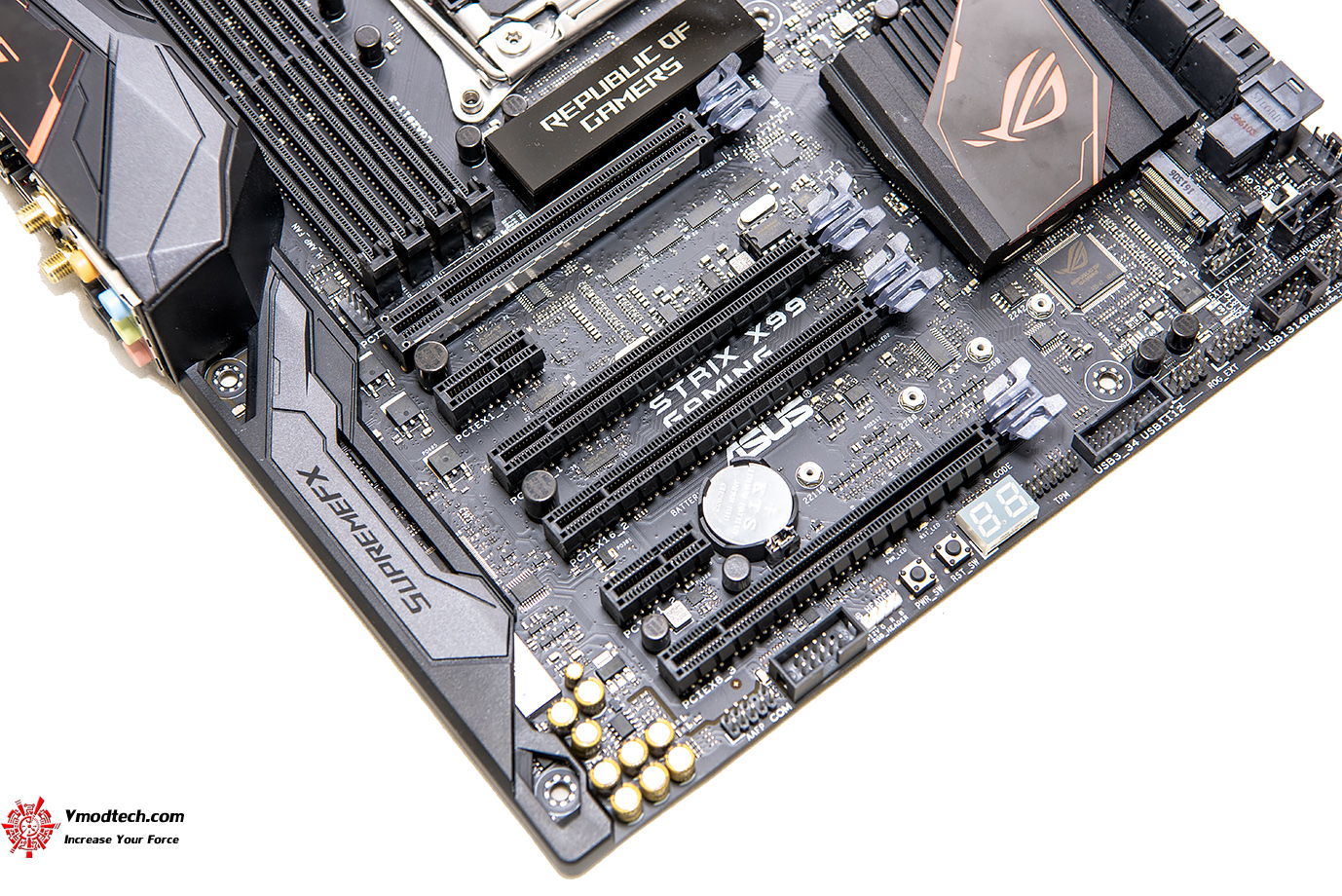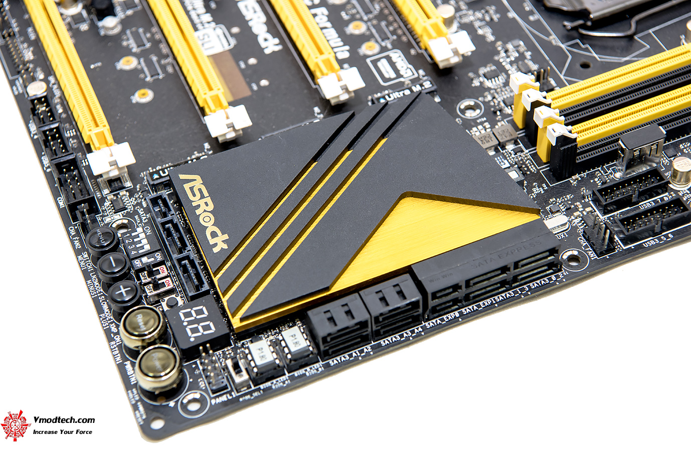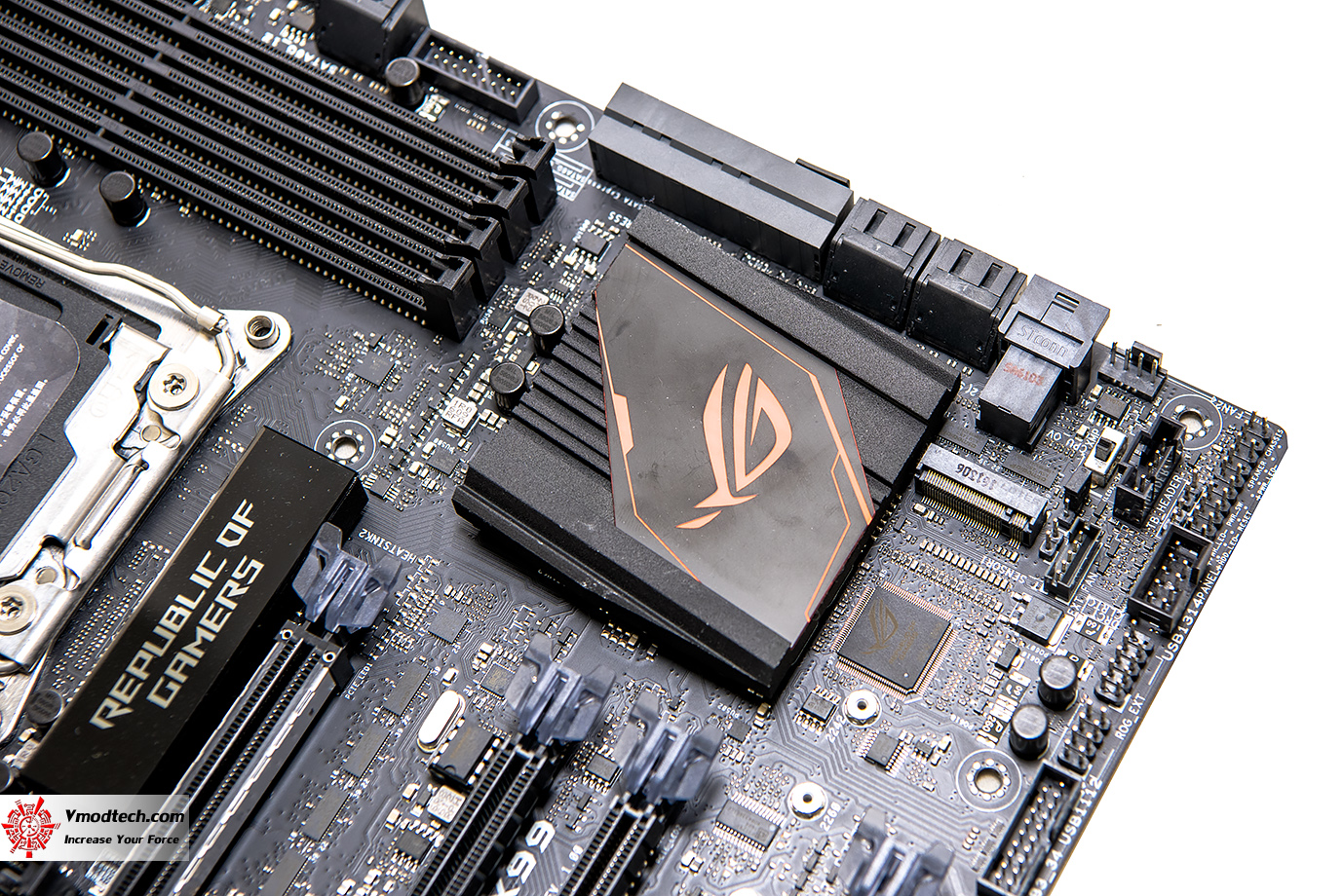 หน้าตาชุดระบายความร้อนให้กับตัวชิปเซต X99 ที่สวยงามกลมกลืนกับตัวมาเธอร์บอร์ดรุ่นนี้เป็นอย่างดี และบริเวณนี้ก็จะมีช่อง SATA3 6.0GB/s อีก 10 ช่องทาง และช่องเสียบ SATA EXPRESS ที่ใช้งานร่วมกับช่อง SATA3 อีก 3 ช่องทางครับ