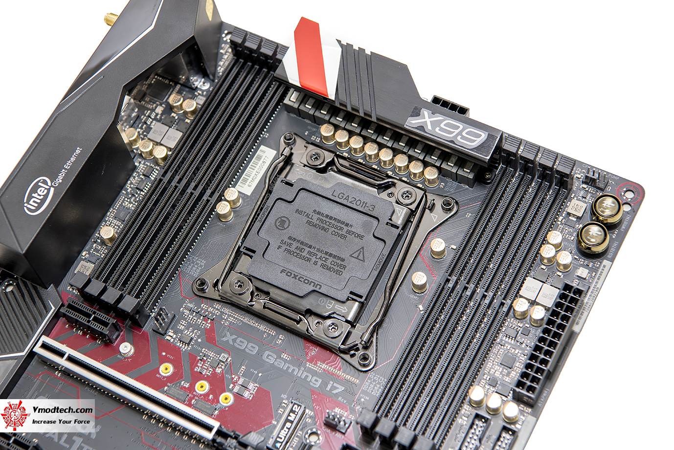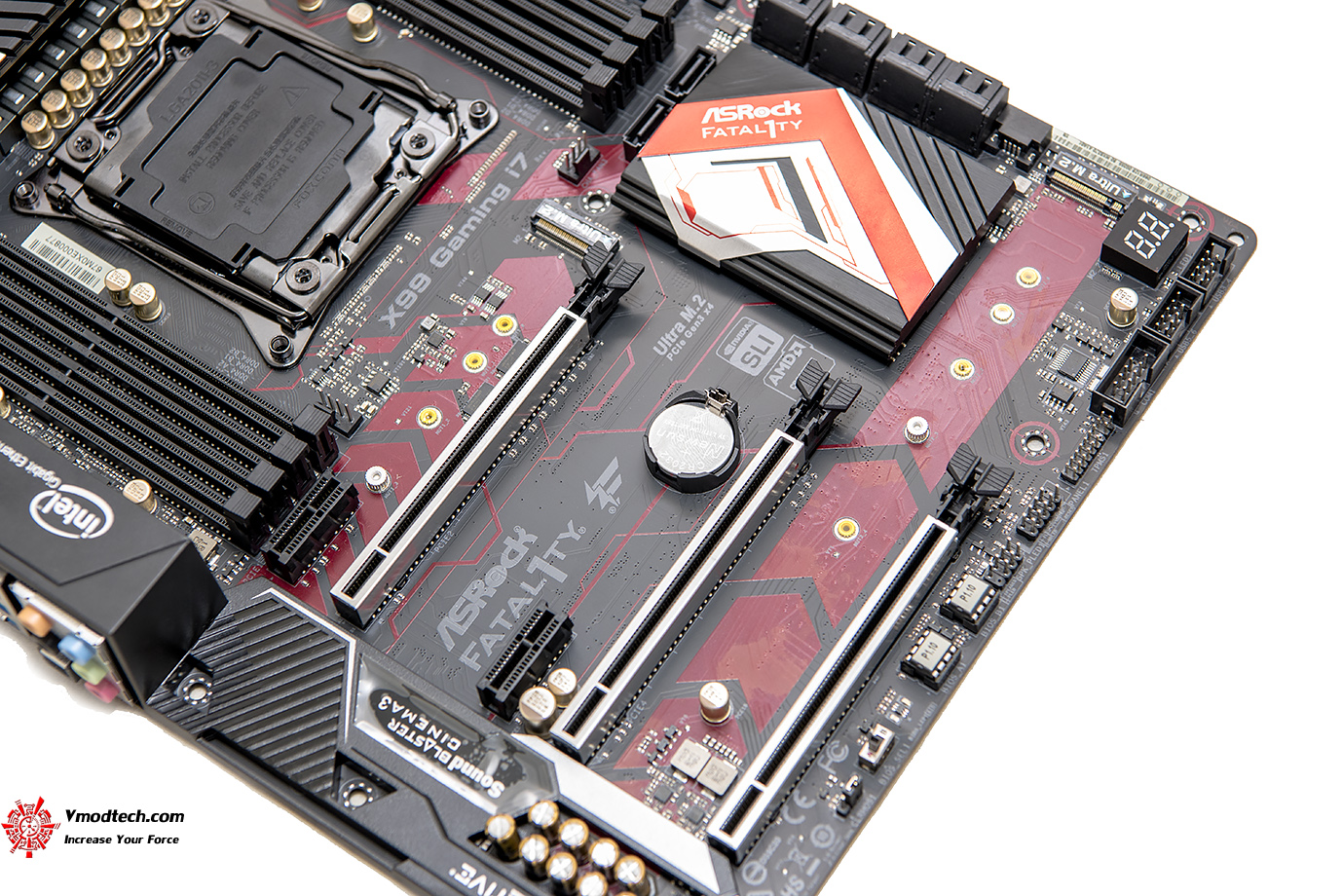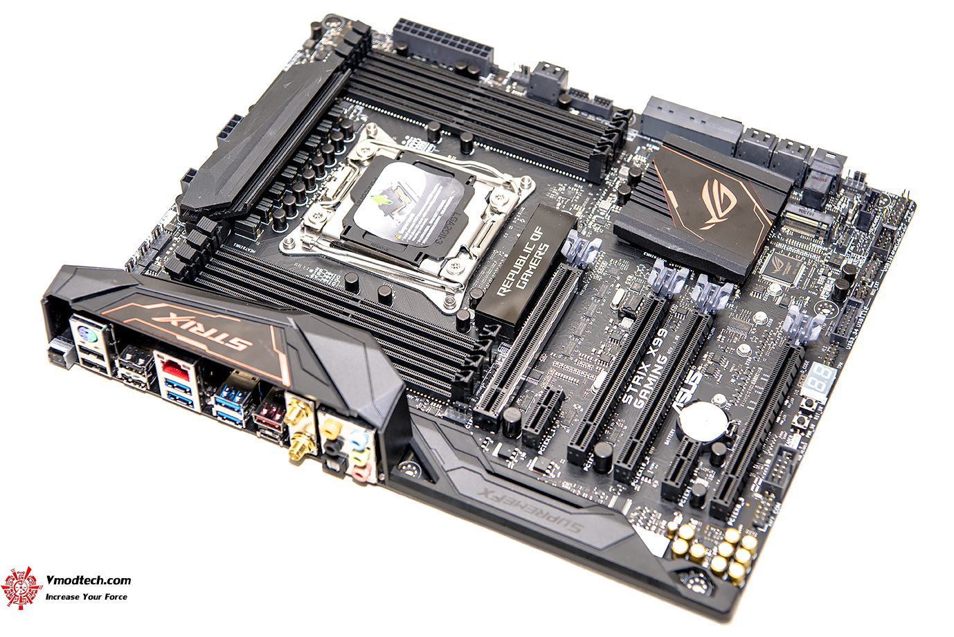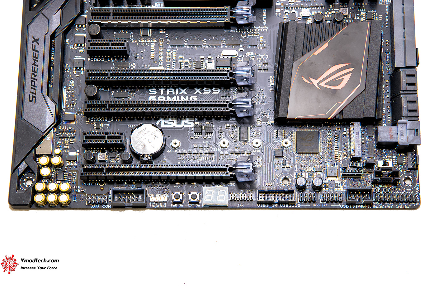 หน้าตาชุดระบายความร้อนให้กับตัวชิปเซต X99 ที่สวยงามกลมกลืนกับตัวมาเธอร์บอร์ดรุ่นนี้เป็นอย่างดี และบริเวณนี้ก็จะมีช่อง SATA3 6.0GB/s อีก 10 ช่องทาง และช่องเสียบ SATA EXPRESS ที่ใช้งานร่วมกับช่อง SATA3 อีก 3 ช่องทางครับ