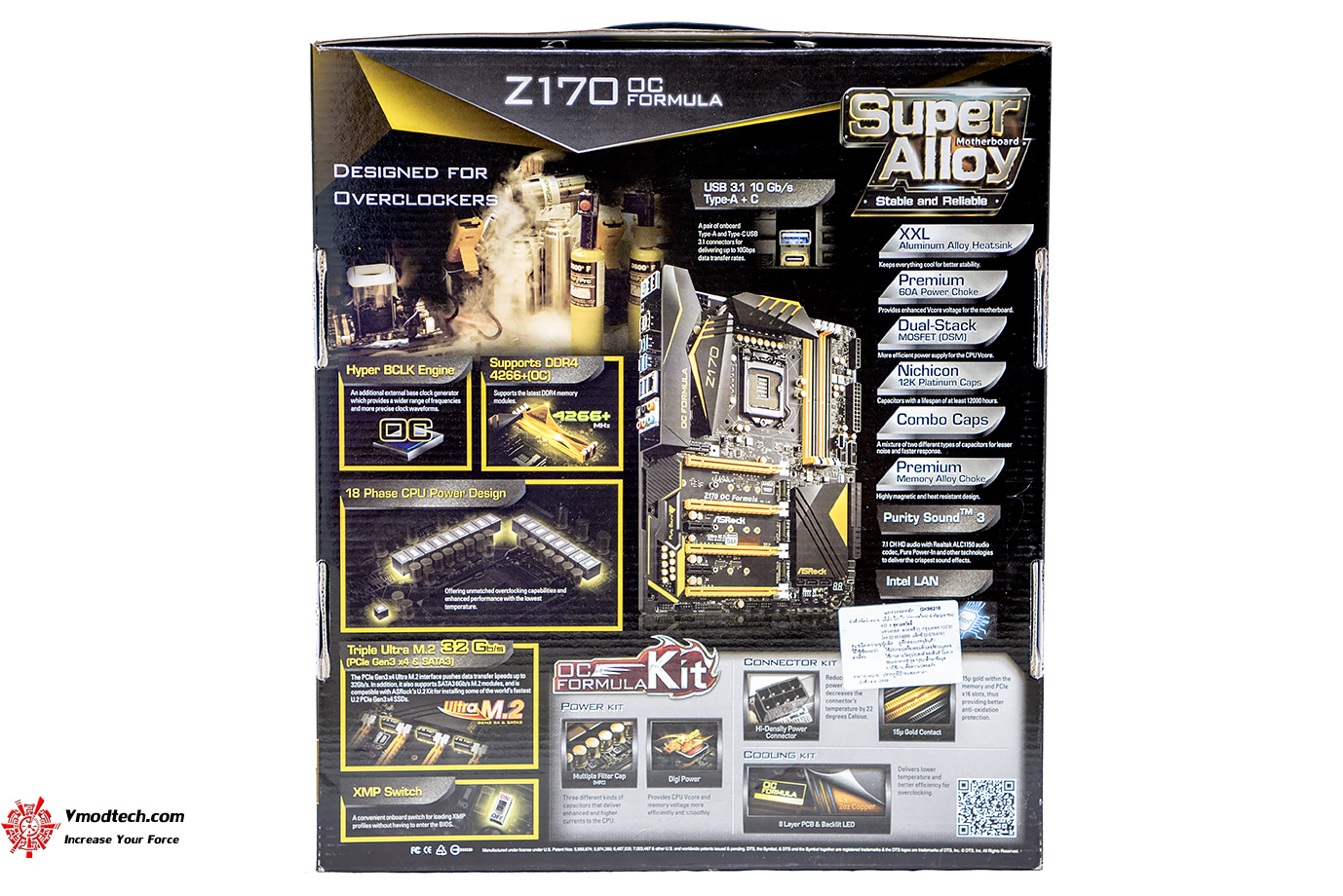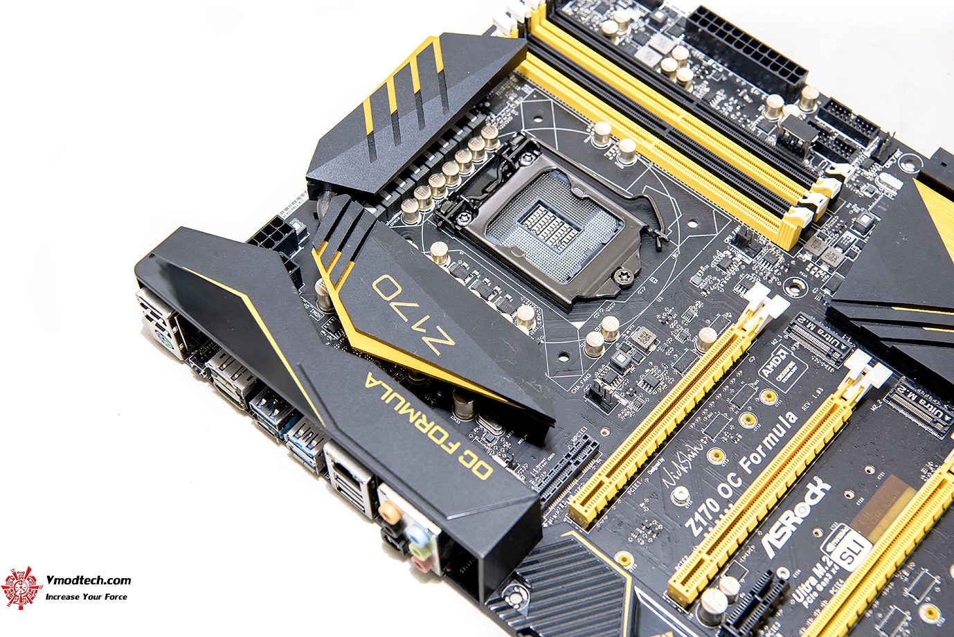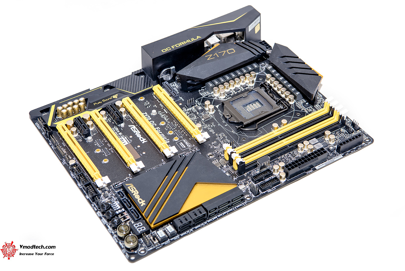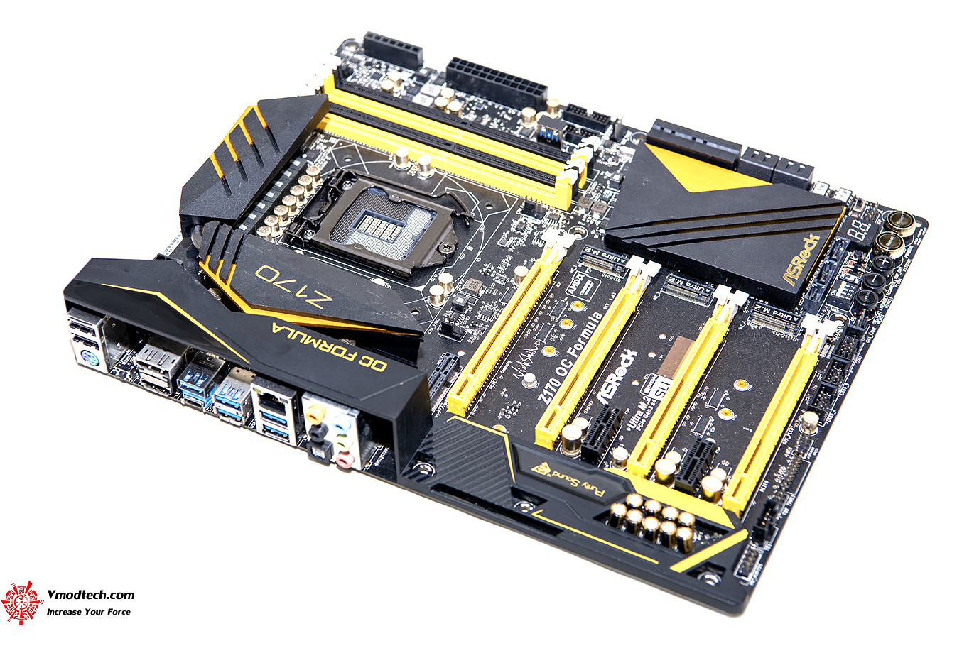 หน้าตาของมาเธอร์บอร์ดรุ่นนี้ จะออกแนวเข้มขรึมดำคาดเหลืองดุดัน ตามสไตล์ OC Formula ครับ