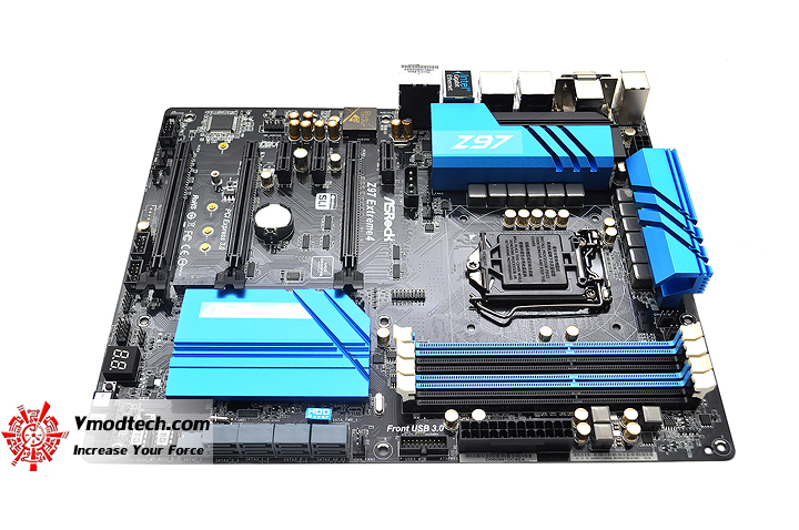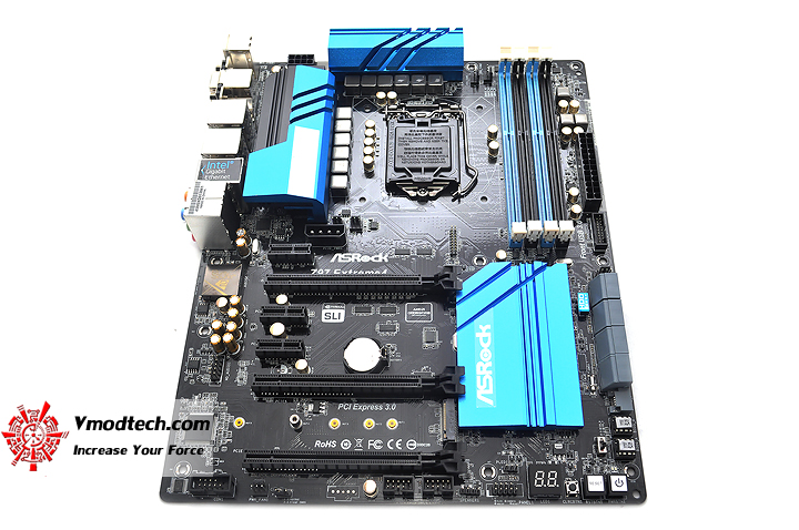 ตัวเมนบอร์ดสีดำสลับสีน้ำเงินสวยงามตัดด้วยซิงค์สีน้ำเงินสวยงาม สไตล์เดียวกับรุ่น ITX ที่รีวิวไปก่อนหน้านี้ครับมาในแนวสีเดียวกันหมดเลยใน Extreme Series ของทาง ASRock