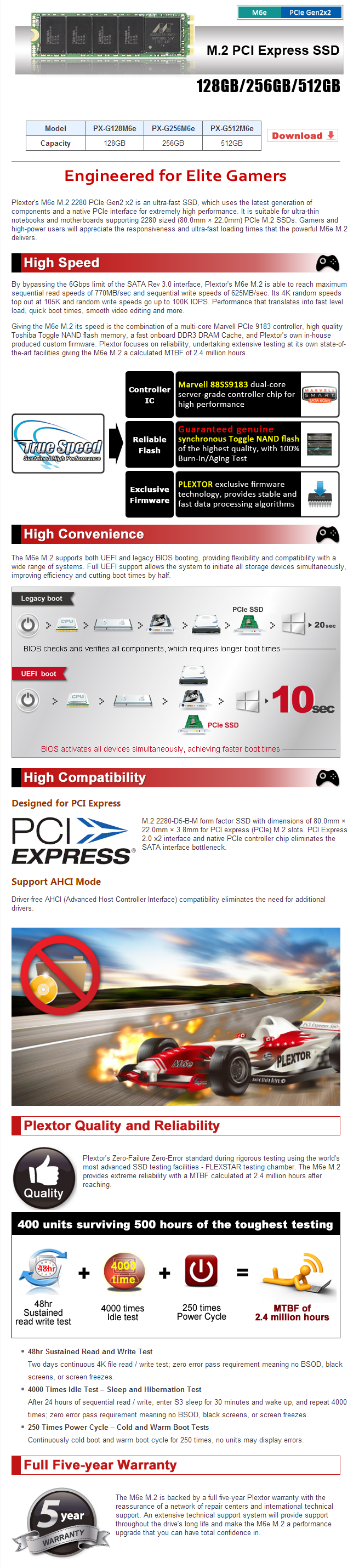 ……….เอาละครับมาว่ากันเลยดีกว่า สำหรับวันนี้จะนำ ASRock Z97 Extreme6 ทดสอบร่วมกับ Plextor PCIe M.2 2280 SSD PX-G128M6e ซึ่งเป็น M.2 PCIe Gen2×2 ที่กำลังเป็นที่น่าจับตามองและหาซื้อได้ในขณะนี้ บทความนี้ผมจะขอกล่าวถึงรายละเอียด Plextor PCIe M.2 2280 SSD PX-G128M6e ไปด้วยในตัวเลยนะครับ สำหรับ ASRock Z97 Extreme6 นั้นผมได้ทำการทดสอบในภาพรวมไปแล้ว สำหรับท่านที่พลาดการทดสอบไปก็เข้าไปชมได้ก่อนเลยครับ “คลิ๊ก” เอาละครับเกริ่นกันมาพอสมควรไปลุยกัยเลยดีกว่า แต่ก่อนอื่น ไปชมรายละเอียดจากเว็บไซค์ผู้ผลิตกันก่อนครับ