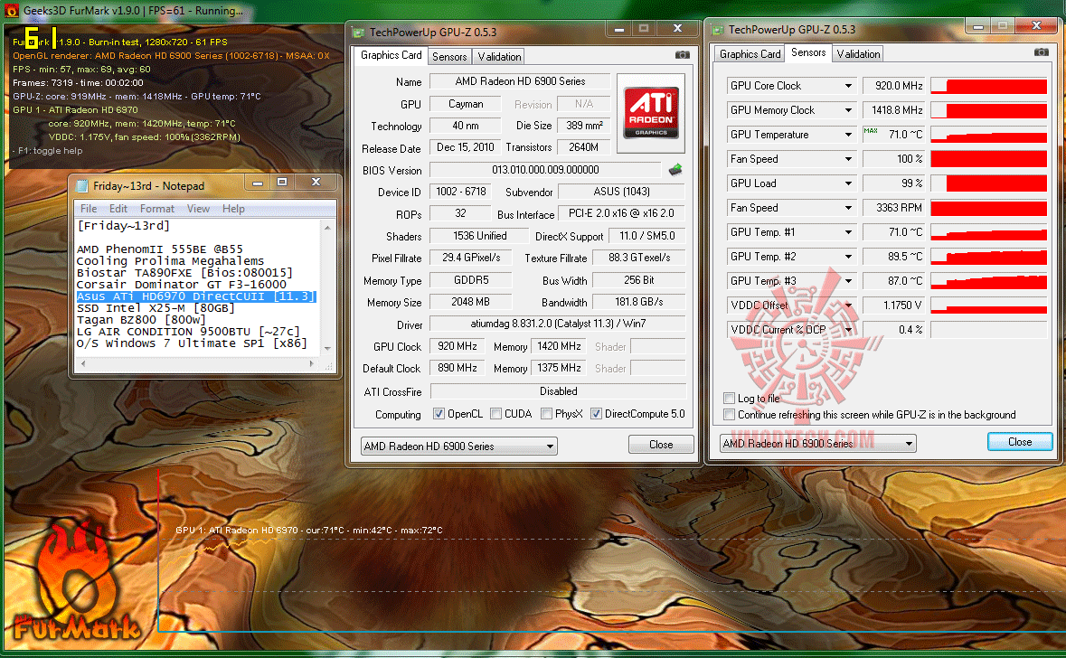 ระดับอุณหภูมิ ปั่นความร้อนให้ออกมาโดย Furmark v1.9.0 ช่วงสภาวะ Idel ของตัว Asus HD6970 DirectCUII ตัวนี้อุณหภูมิจะอยู่ที่ช่วงประมาณ 42C-45C เท่านั้น แต่หลังจากอัดไปเพียง 2 นาที อุณหภูมิสูงสุดในโหมด O/C ตั้งพัดลมให้หมุนเต็มที่ 100% อุณหภูมิสูงสุดไปจอดนิ่งอยู่ที่ 72 องศาC, ส่วนโหมด Default กับรอบพัดลมทำงานแบบ Auto อุณหภูมิสูงสุดหยุดอยู่ที่ 79 องศาC จัดได้ว่าความร้อนที่เกิดจากการทำงานทั้ง 2 โหมดนี้ บน Furmark ไม่ร้อนมากมายนัก หากใช้งานจริงบน Application อื่นๆ ต่อให้อัดหนักๆ ยาวๆ เพียงใด ก็ไม่ปล่อยความร้อนจัดๆ เหมือน Furmark อย่างแน่นอน