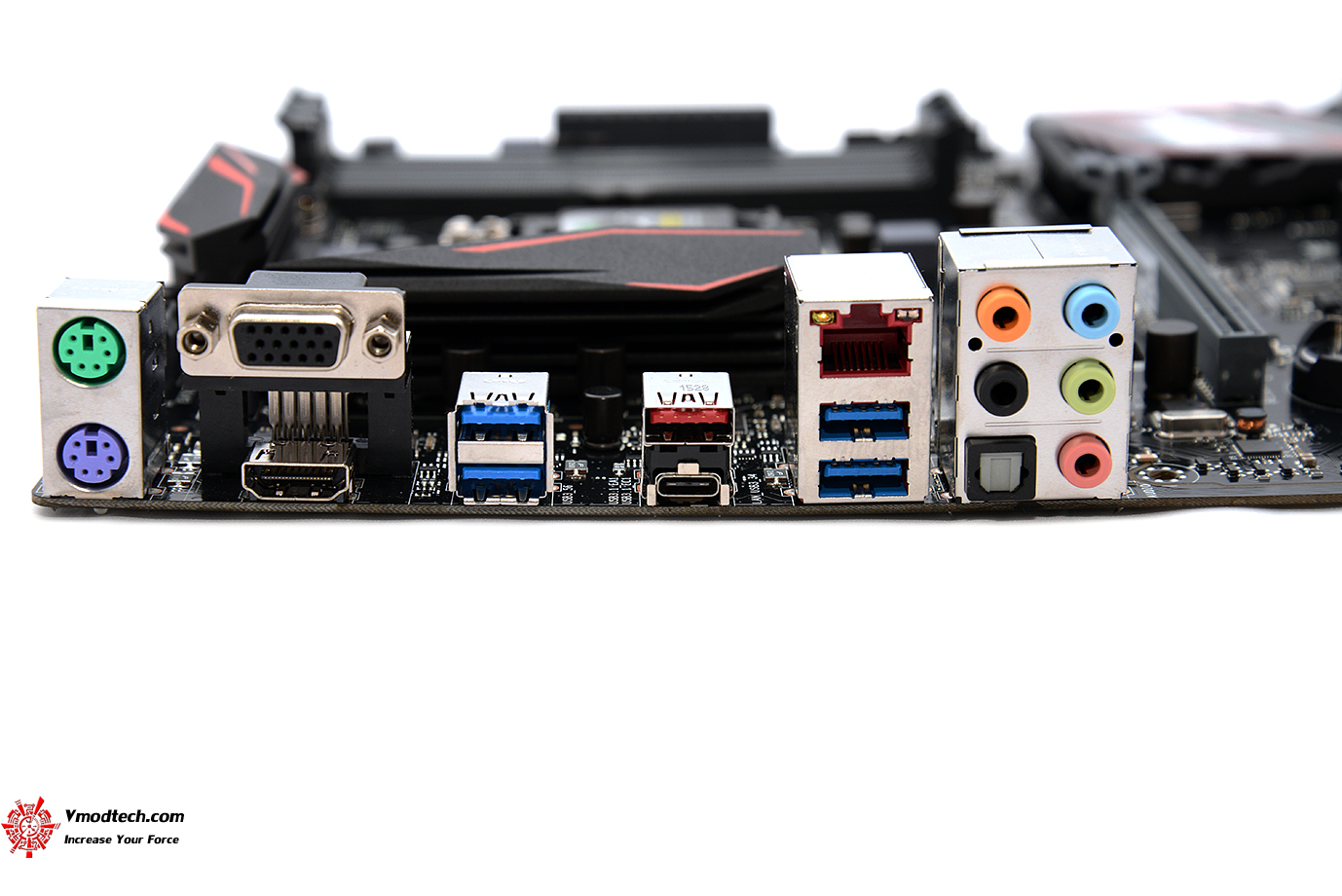 มาดูพาแนลด้านหลังกันบ้างครับ ประกอบด้วย 1 x PS/2 keyboard (purple) , 1 x PS/2 mouse (green) , 1 x D-Sub , 1 x HDMI , 1 x LAN (RJ45) port(s) , 1 x USB 3.1 (red)Type-A , 1 x USB 3.1 Type-C , 4 x USB 3.0 , 1 x Optical S/PDIF out , 5 x Audio jack(s) และยังมีระบบ ESD Guards on LAN, Audio, KBMS and USB3.0/2.0 ports และ Stainless Steel Back I/O ปกป้องความปลอดภัยให้ด้วยครับ แจ่มจริงๆ แถมไม่เกิดคราบอ๊อกไซด์ง่ายๆอีกด้วย
