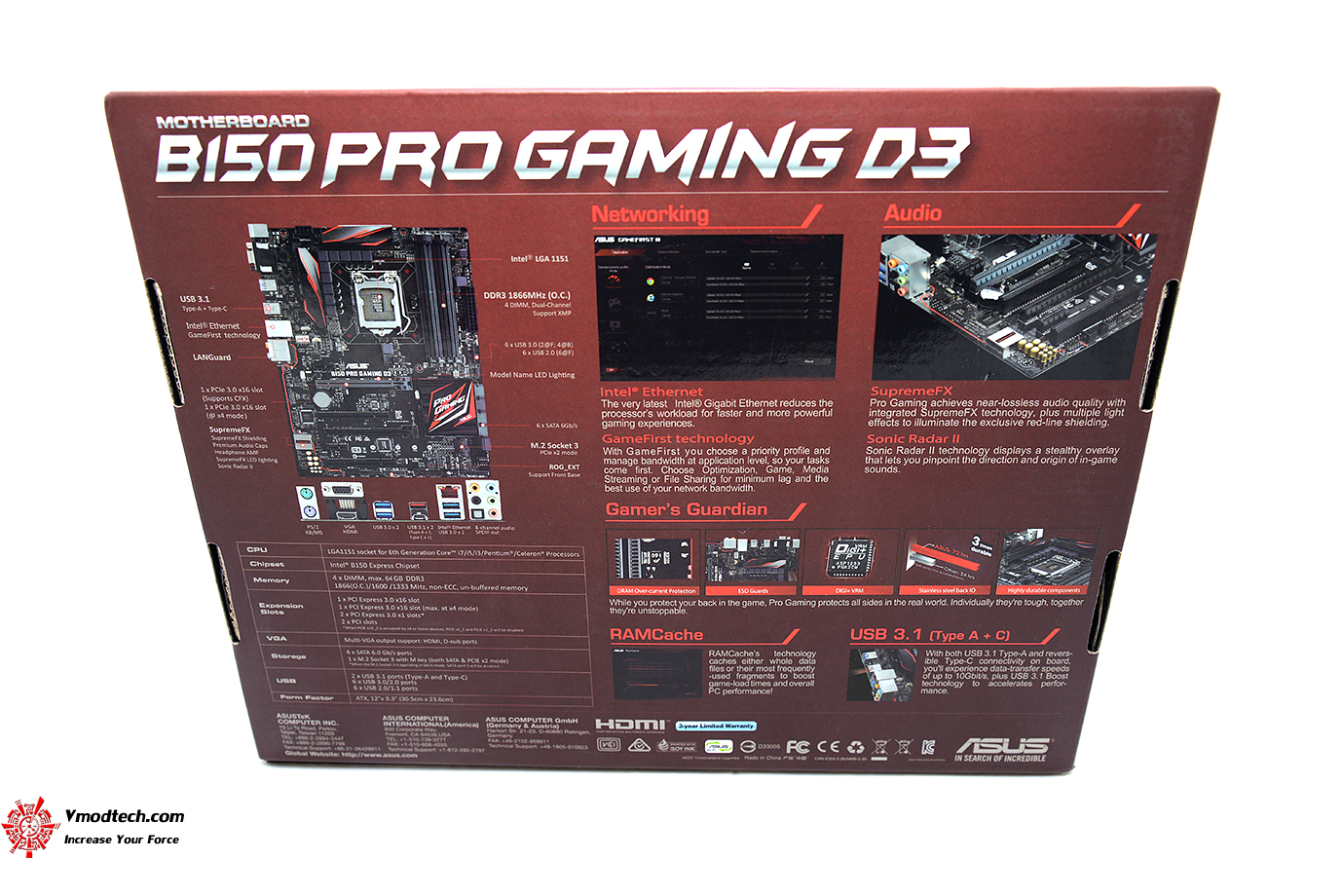 สวัสดีทุกท่านที่เยี่ยมชมเว็บไซต์ Vmodtech.com ในวันนี้เรามาชมรีวิวเมนบอร์ดที่รองรับซีพียู Intel Skylake กันต่อเนื่องเลยครับ โดยในวันนี้จะเป็นรุ่นชิบเซ็ต B150 ซึ่งเป็นเมนบอร์ดที่มีจุดเด่นตรงที่รองรับการทำงานของแรม DDR3 ครับ ซึ่งก็เป็นเมนบอร์ดในรุ่นราคาประหยัดที่ออกมาให้ใช้งานกันครับ แต่สำหรับเมนบอร์ดที่ผมนำมาให้ท่านได้ชมกันวันนี้มากันในแบรนด์ดังอย่างยี่ห้อ ASUS ในชื่อรุ่นเต็มๆว่า ASUS B150 PRO GAMING D3 ซึ่งเป็นเมนบอร์ด GAMING ซีรี่ย์ของทาง ASUS ที่ขนบรรดาฟีเจอร์แรงๆสำหรับบรรดาเกมส์เมอร์มาให้โดยเฉพาะแทบไม่ต่างจากเมนบอร์ดในรุ่นใหญ่ๆเลยครับ อาทิ Superior Specs , Gaming Audio , Gaming Networking , Gamer’s Guardian เรียกได้ว่าเป็นฟีเจอร์หลักๆของ ASUS GAMING ซีรี่ย์เลยทีเดียวครับ ส่วนประสิทธิภาพความแรงจะเป็นเช่นไรนั้นเดี๋ยวเราไปชมกันครับ แต่ก่อนอื่นไปชมรายละเอียดจากทางผู้ผลิตกันก่อนครับ
