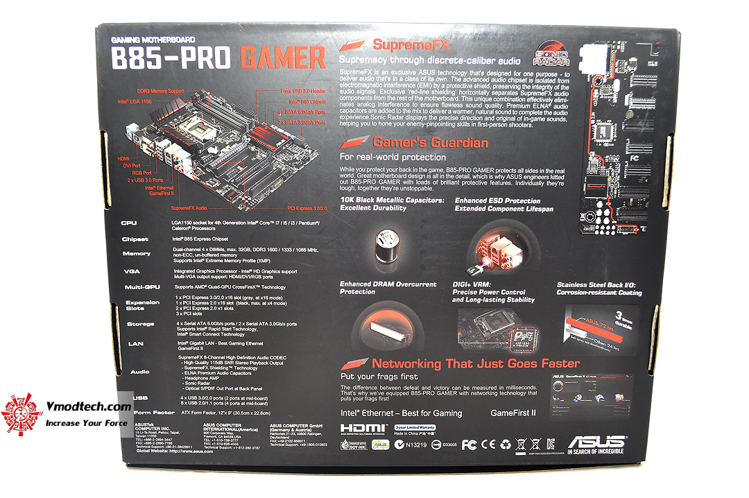 สวัสดีครับ ทุกๆท่านที่เยี่ยมชมเว็บไซต์ Vmodtech.com ในวันนี้เรามาชมรีวิวเมนบอร์ดใหม่ล่าสุดของของทาง INTEL กันครับ กับเมนบอร์ดชิบเซ็ต B85 ซึ่งเป็นเมนบอร์ดของทางค่าย ASUS อีกหนึ่งแบรนด์คุณภาพเยี่ยมมากันในรุ่น ASUS B85-PRO GAMER ที่ออกแบบมาสำหรับบรรดาคอเกมส์เมอร์โดยเฉพาะครับ ด้วยฟีเจอร์ที่สำคัญๆสำหรับบรรดาเกมส์ขาโหดไม่ว่าจะเป็น Intel Gigabit Ethernet & GameFirst II , SupremeFX , Sonic Radar สำหรับบรรดาคอเกมส์แบบเต็มพิกัดอีกด้วย เดี๋ยวเรามาชมกันครับว่าประสิทธิภาพต่างๆของเมนบอร์ดนั้นเป็นเช่นไร ก่อนอื่นเราไปชมรายละเอียดจากทางเว็บไซต์กันก่อนครับ