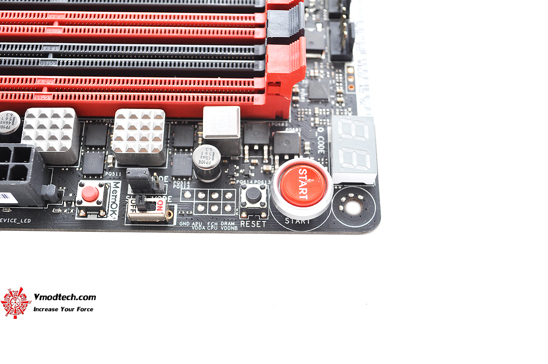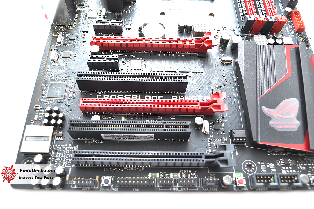 มีสวิตช์ Power,Reset, mem OK กรณีที่โอเวอร์คล๊อกแรมแล้วติดไม่อยากรณีไบออสใหม่ กดปุ่มนี้ก็ผ่านได้เลยครับแล้วค่อยกลับไปตั้งกันใหม่ ครบเครื่องเหมือนกับเมนบอร์ด ROG ในรุ่นทั่วๆไป