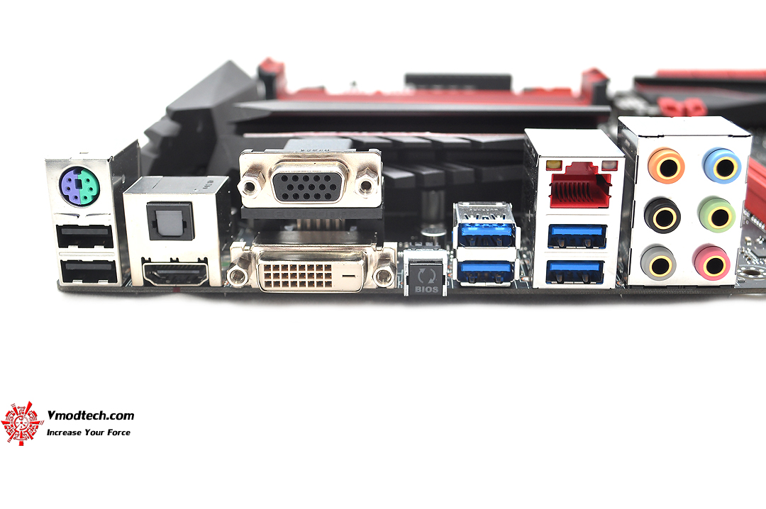 พาแนลด้าน หลัง ประกอบด้วย 1 x PS/2 keyboard/mouse combo port(s) , 1 x DVI-D , 1 x D-Sub , 1 x HDMI , 1 x LAN (RJ45) port(s) , 4 x USB 3.0 (blue) , 2 x USB 2.0 , 1 x Optical S/PDIF out , 6 x Audio jack(s) , 1 x USB BIOS Flashback Button(s) ให้มาเยอะเลยทีเดียว