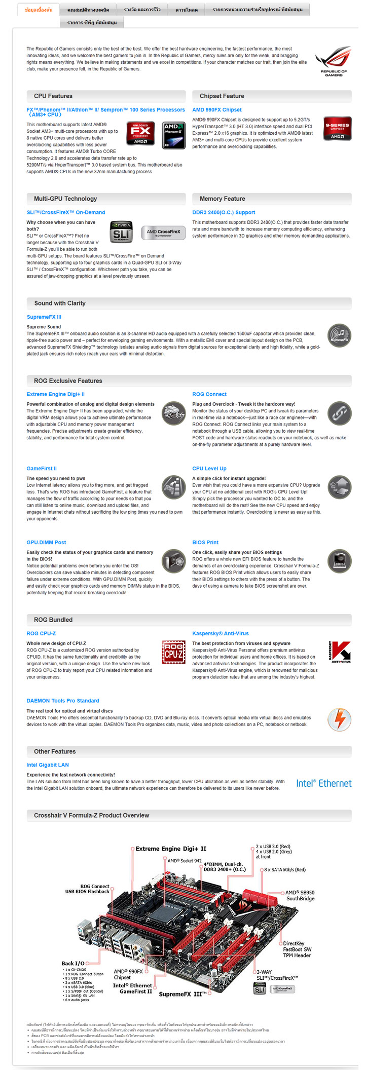 สวัสดีทุกๆท่านที่เยี่ยมชมเว็บไซต์ Vmodtech.com กับโฉมใหม่อัดแน่นด้วยเนื้อหาสาระทางด้านอุปกรณ์ไอทีที่อัพเดทกันตลอดทุกวัน และในวันนี้ก็ถึงคิวของสาวก AMD (เอเอ็มดี) กันอีกรอบครับกับเมนบอร์ดตัวแรงจากทางค่าย ASUS ที่ออกมารองรับซีพียูตัวล่าสุดของทาง AMD นั่นก็คือ ASUS Crosshair V Formula-Z พระเอกของเราในวันนี้ ซึ่งในวันนี้ต้องขอบอกเลยครับว่าแรงสะใจขาโหดของเอเอ็มดีกันอีกเช่นเคย สำหรับเมนบอร์ด ASUS Crosshair V Formula-Z นั้นเป็นเมนบอร์ดรุ่นใหญ่สุดในซ๊อกเก็ต AM3+ กันเลยทีเดียวครับ หรือพูดง่ายๆคือออกแบบมาสำหรับโอเวอร์คล๊อกกันโดยเฉพาะมีฟีเจอร์ให้เลือกใช้งานอย่างมากมายทั้งฮาดแวร์และซอฟแวร์ในการปรับแต่งนี่เพียบจริงๆครับตามแบบฉบับ ROG และที่ขาดไม่ได้คือผู้ที่ชื่นชอบความสวยงามของตัวเมนบอร์ดต้องบอกว่าสวยงามดุดันแถมตอนเปิดใช้งานมีไฟสีแดงวิ่งตรงขอบเมนบอร์ดด้วยแบบนี้ทั้งสวยทั้งแรงแต่จะแรงกันขนาดไหนก่อนอื่นเราไปชมรายละเอียดจากทางผู้ผลิตกันก่อนครับ