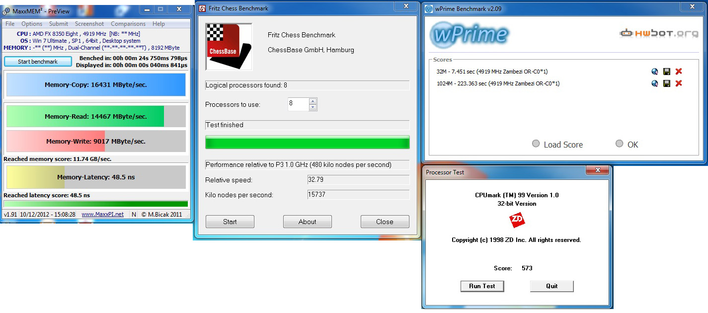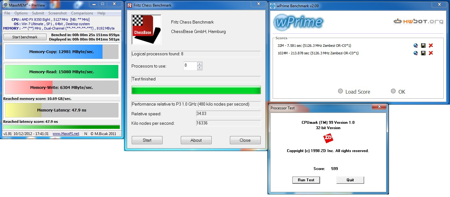 wPrime2.09 , CPUMark99 MaxxMem & Fritz Chess Benchmark
