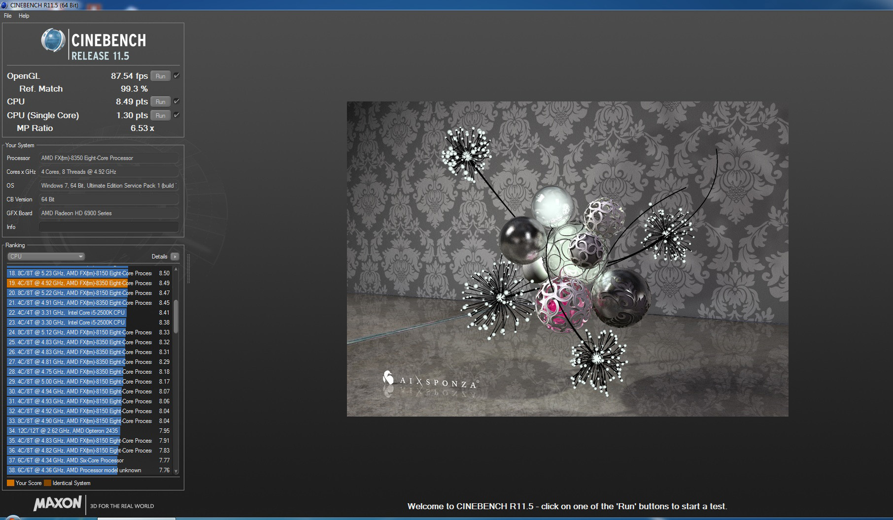 Cinebench R11.5 คะแนนเรนเดอร์ทั้ง8หัว อยู่ที่ 8.49คะแนน แรงมากๆเลยครับกับการเรนเดอร์การทำงานของซีพียูผ่านไปได้ครับผม