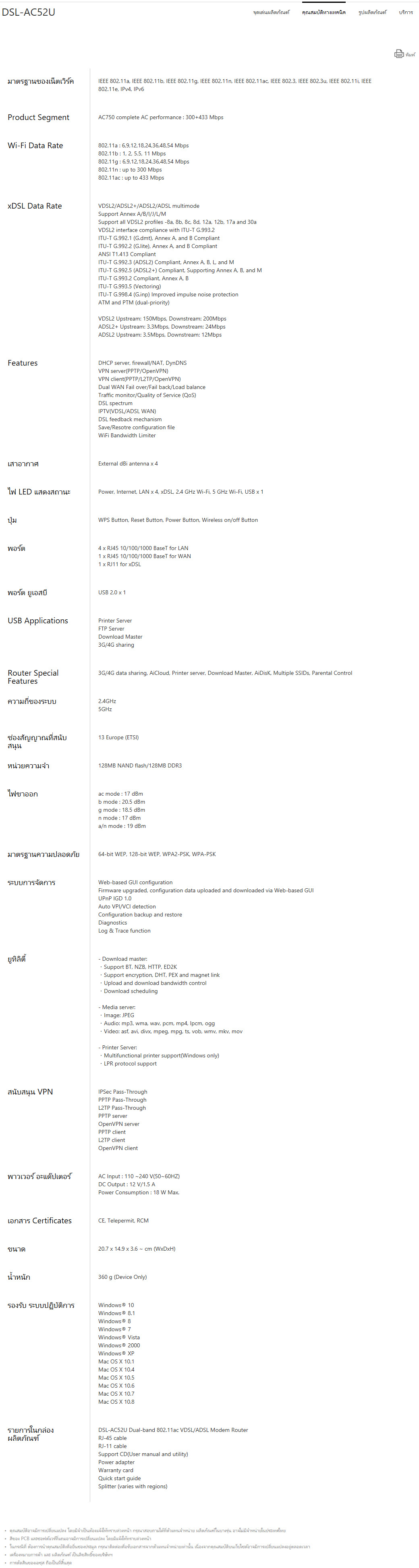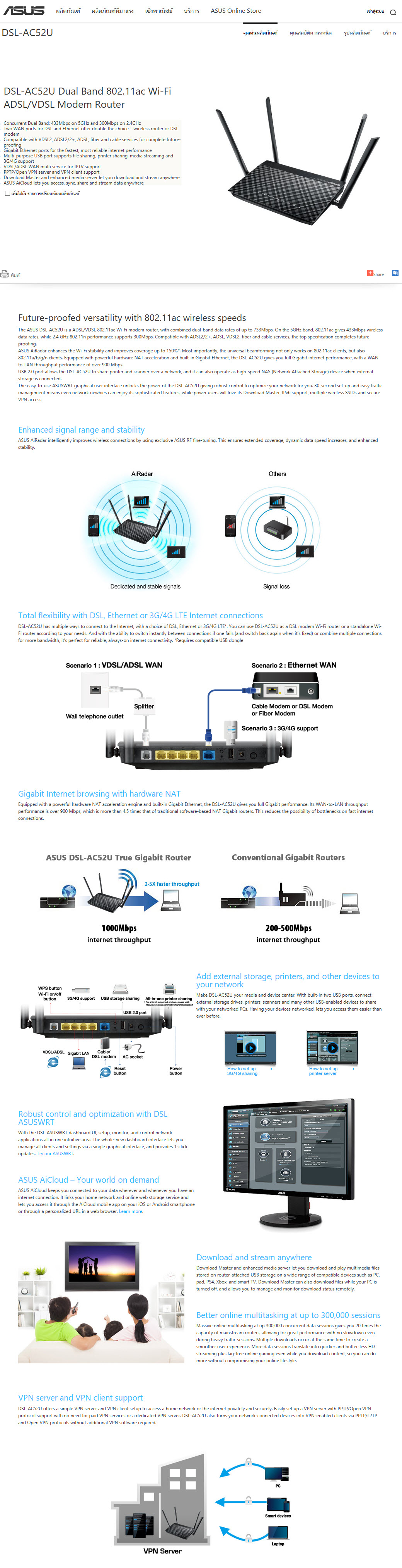 สวัสดีครับ วันนี้มี ADSL/VDSL Modem Router จากแบรนด์ผู้นำด้านเราเตอร์ที่เรารู้จักกันดีมาแนะนำให้ได้ชมครับ ASUS DSL-AC52U นั้นเป็น Modem Router ที่สามารถต่อเชื่อมอินเตอร์เนตแบบ VDSL หรือ ADSL ก็ได้ครับ โดยตัวเราเตอร์นั้นสามารถกระจาย WiFi ได้สองย่านความถี่คือบนย่าน 5 GHz ได้ที่ความเร็ว 433 Mbps และย่าน 2.4 GHz ได้ 300 Mbps รวมถึงฟังก์ชั่นพื้นฐานที่ควรจะมีบนเราเตอร์ดีๆซักเครื่องนึงในราคาที่ไม่สูงนัก มันเหมาะกับการอัพเกรดระบบเพื่อใช้ความสามารถด้านไร้สายบนย่าน AC ครับ เรามาชมรายละเอียดกันเลย