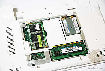 รูปซ้าย เทียบขนาดกับเลนซ์ผมครับ หุหุ เล็กสะใจดีจริงๆครับ … ส่วนไส้ใน เปิดออกมา พบว่ามันโล่งโจ้งดีครับ มีการ์ด Wireless เสียบอยู่ และ Harddisk แบบ Solid (ด้านซ้ายมือ) จาก Phison และ เมมโมรีแบบ DDR2 1024mb ครับ (อ้อ มีมาให้สลอตเดียวนะครับ หุหุ)