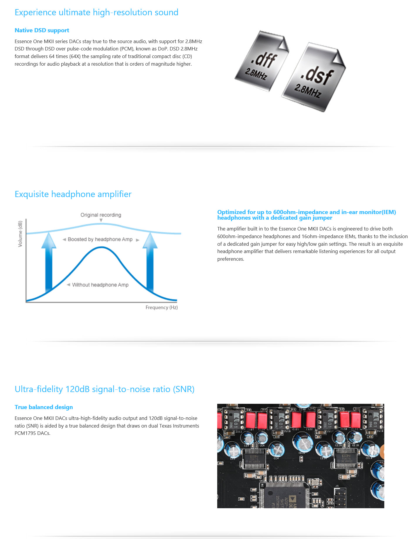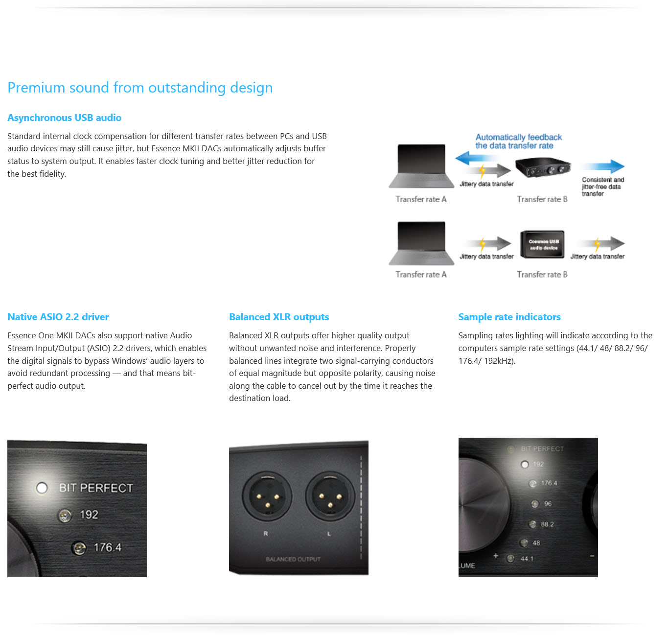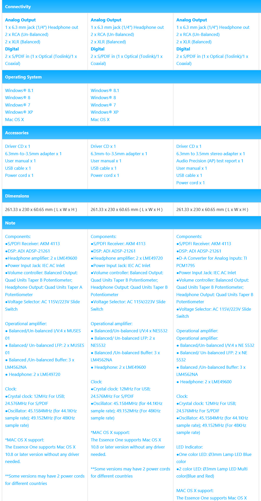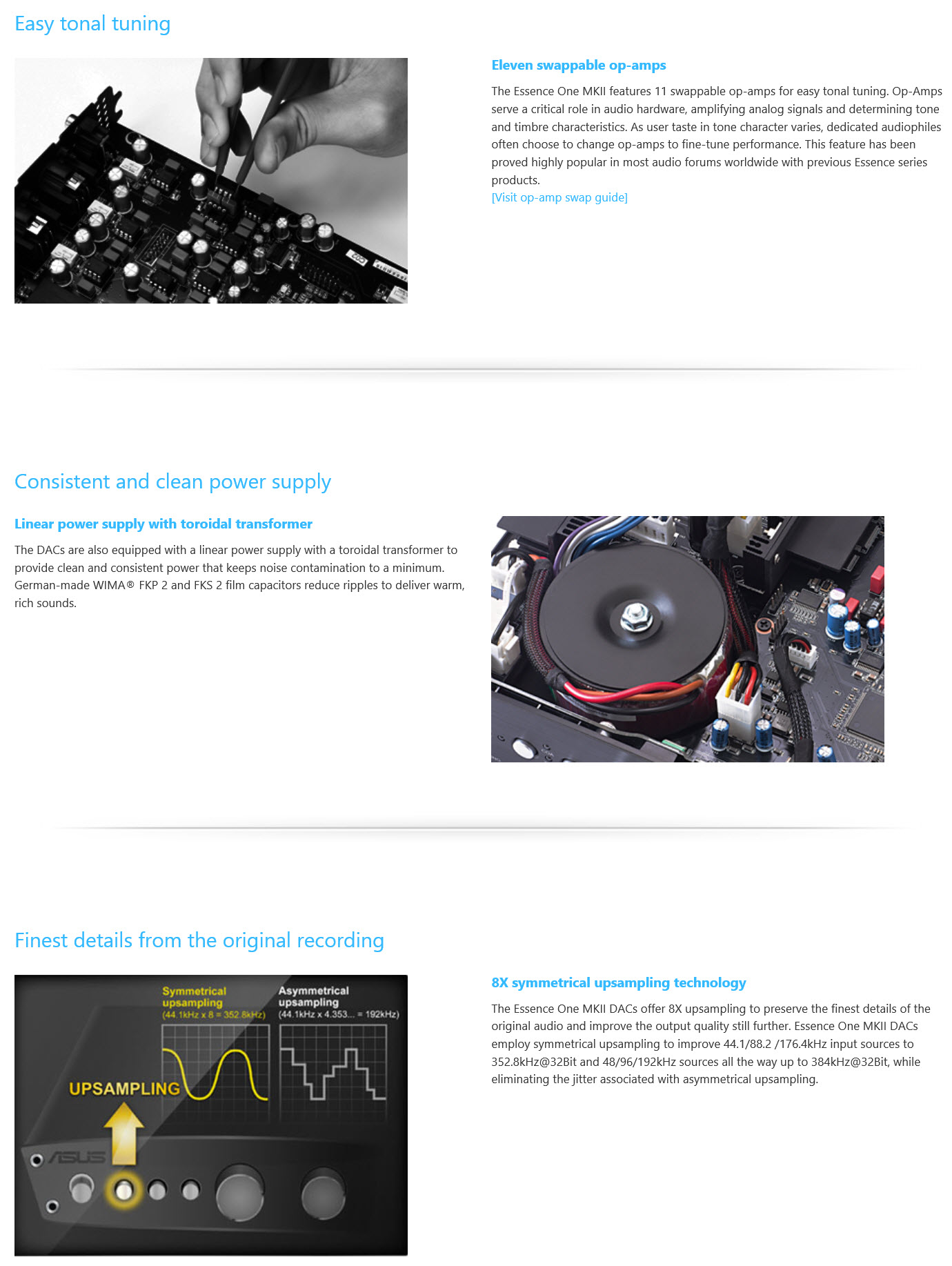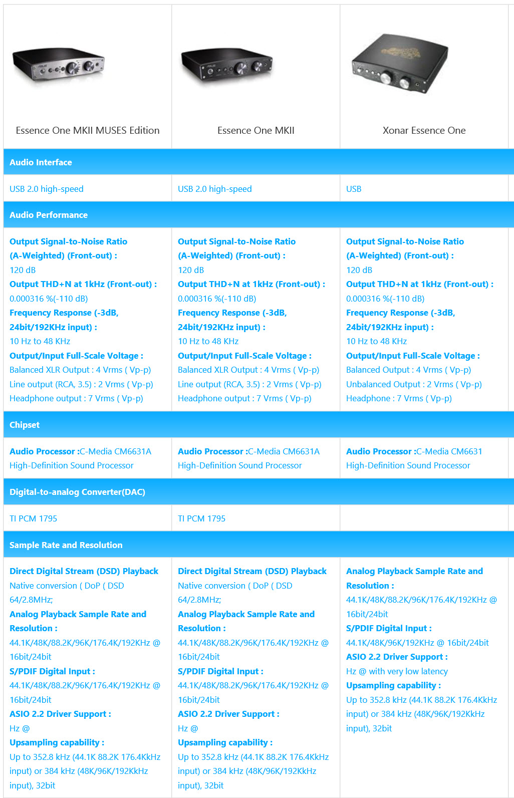 รายละเอียดเชิงเทคนิคนั้นก็ตามรายละเอียดจาก ASUS ด้านบนครับ เมื่อเปรียบเทียบกับ DAC ในกลุ่มเดียวกันแล้วนั้นจะเห็นได้ว่า ESSENCE One MK II นั้นจะมีความต่างจาก ESSENCE ONE ตัวมาตรฐานอยู่พอสมควร แต่จะต่างจากตัวท๊อปอย่าง MUSES Edition เพียงแค่ Op-amp ที่ใช้เท่านั้น ถึงแม้ว่าคนส่วนใหญ่จะให้ความเห็นว่า MUSES 01 นั้นให้เสียงที่ดีที่สุด แต่ส่วนตัวนั้นคิดว่ารสนิยมการฟังน่าจะเป็นตัวตัดสินครับว่าเราจำเป็นมั๊ยที่ต้องจ่ายเพิ่มอีกเกือบเท่าตัวเพื่ออัพเกรดจากรุ่นนี้เป็น MUSES Edition หรือเหลือกหาออปแอมป์ตัวที่ว่ามาเปลี่ยนที่ภาพเอาท์พุตที่เราใช้งานเท่านั้น ซึ่งแน่นอนว่าเราสามารถหาเจ้า MUSES Op-amp ได้จากท้องตลาดในราคาที่ต่ำกว่า
