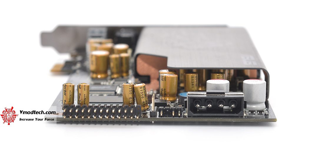 ตัว ESSENCE STX II นั้นเป็น Sound Card ที่มีอินเตอร์เฟสการเชื่อมต่อแบบ PCI Express, PCB เป็นสีดำ มองมุมนี้จะเห็น นิชิคอน โกล แค๊ป เต็มพื่นที่เลย