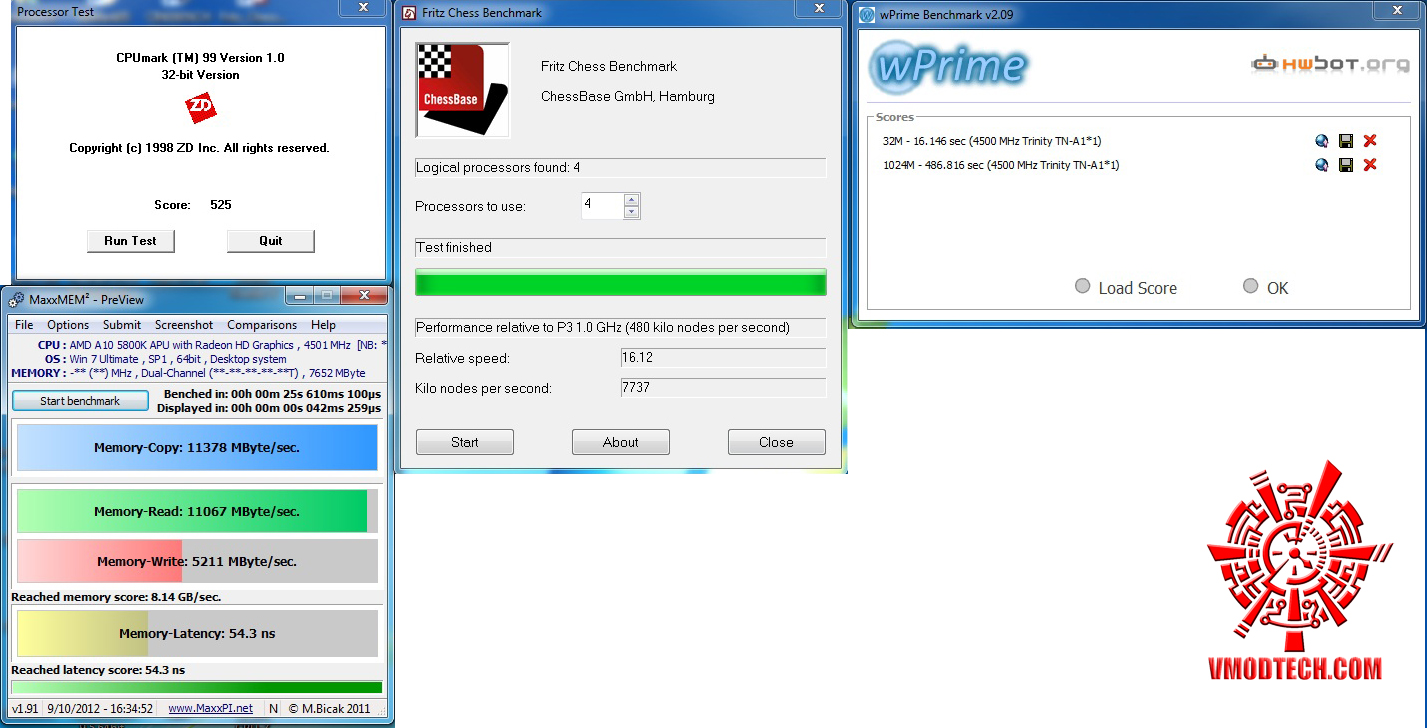 wPrime2.09 , CPUMark99 MaxxMem & Fritz Chess Benchmark