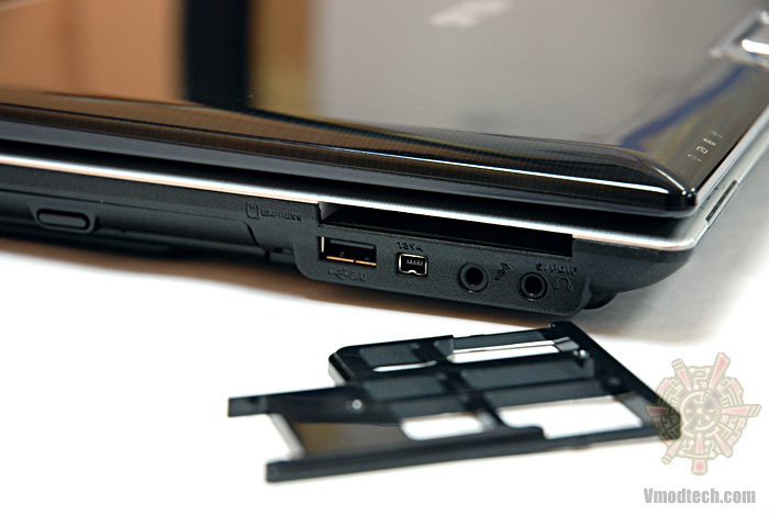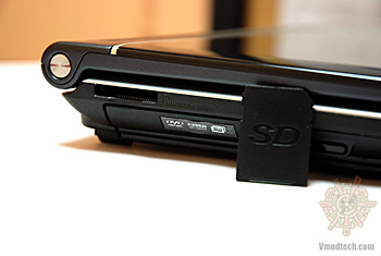 ดังที่ได้ว่ากันไปแล้วในสเปคครับ พอร์ตเชื่อมต่อ ด้านซ้ายมือ ก็จะมี Audio out ทั้งหลาย USB 2.0 1 พอร์ต IEEE1394 แบบหัวเล็กอีกหนึ่ง และพอร์ตสำหรับ PCIExpress การ์ด(สำหรับโน๊ตบุ๊ก) อีกหนึ่งพอร์ต ที่มาแทนพอร์ต PCMCIA แบบเก่าครับ นอกจากนี้ก็ยังมี SD/MMC (micro compatible) Cardreader อยู่เหนือไดร์ฟ DVD-RW อีกด้วยครับ