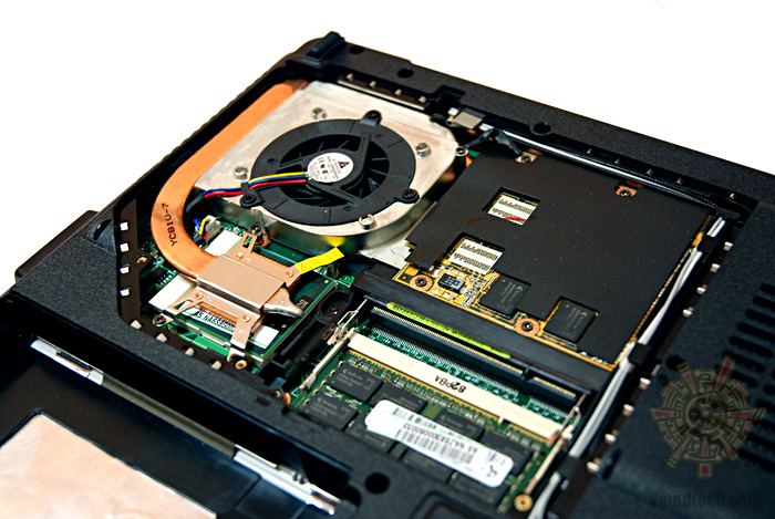 เปิดฝาหลังฝาหลักมา ก็จะพบฮีทไปป์ทองแดง กับพัดลมโบลวเวอร์หนึ่งตัว ขดกันอยู่ท่ามกลางแรม การ์ดจอ และซีพียูครับ อ้อ สังเกตดูนะครับ F8 นั้นใช้ฮีทไปป์ชุดเดียวกันกับซีพียู ในการระบายความร้อนการ์ดจอ HD3470 นะครับ ส่วนแรม DDR2 800mhz CL6 นั้นเป็นชิปของ Qimonda ครับ