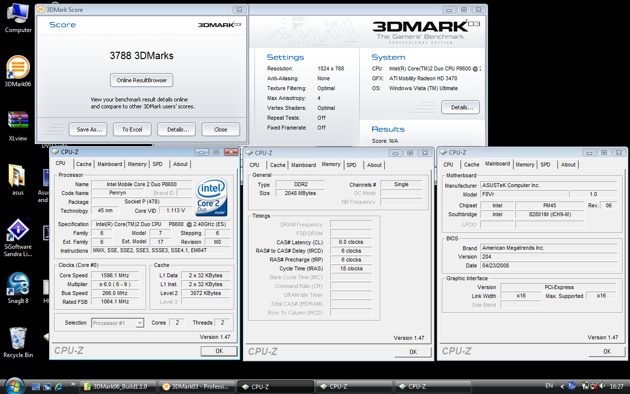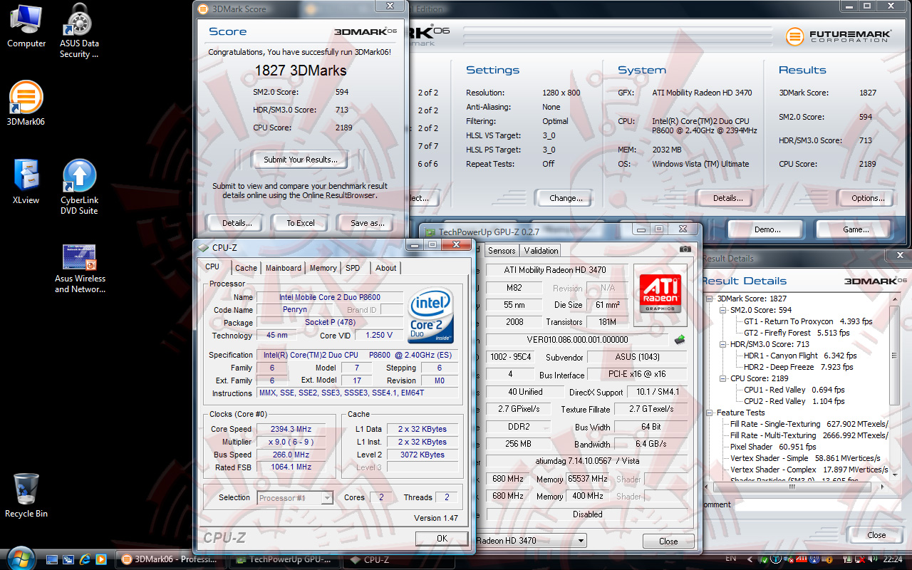 | Benchmark | 3Dmark03, 3Dmark05, 3Dmark06, PCmark05 SisoftSandra, Everest Ultimate, Cinebench2003, CineBench R10, Super PI XS 1.5 |