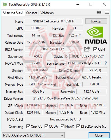 ASUS GeForce GTX 1050 Ti from GPUZ