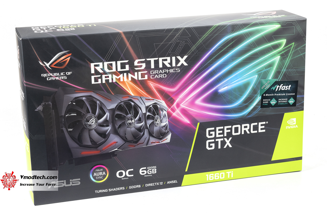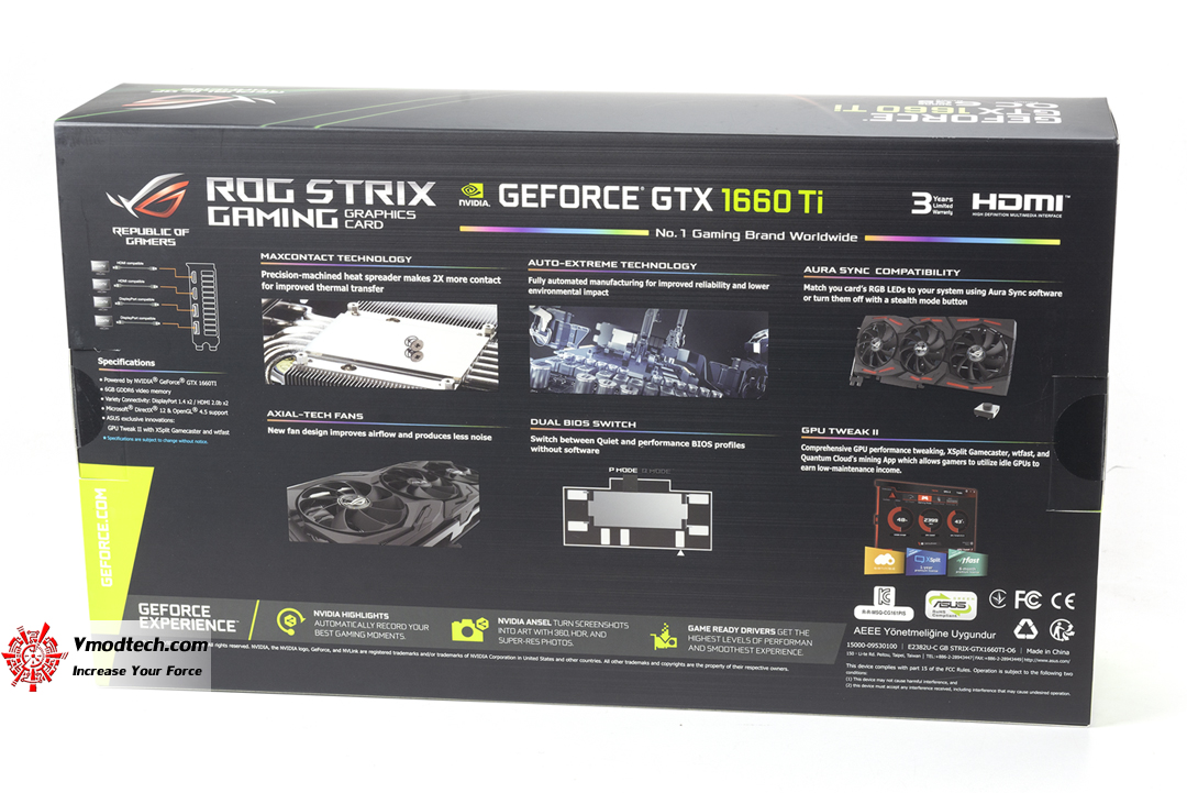 ASUS GeForce GTX 1660 Ti ROG Strix Gaming นั้นมาพร้อมกับแพกเกจที่ถูกออกแบบมาเป็นพิเศษสวยงามพร้อมกับรายละเอียดของตัวการ์ดที่มีระบุไว้ด้านหลังของกล่องบรรจุ