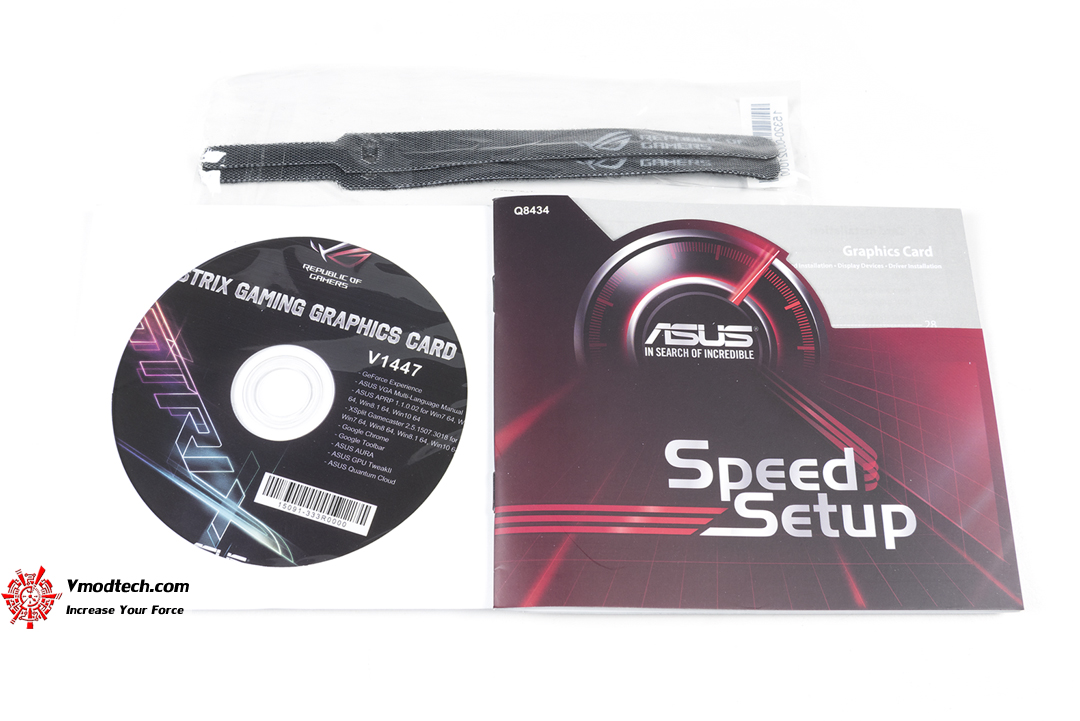 ในกล่องนั้นจะมีคู่มือการใช้งานแผ่นพับมาให้ แผ่น software และสายรัด ROG อีกสองเส้นเอาไว้รวบสายไฟ