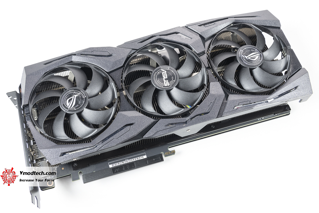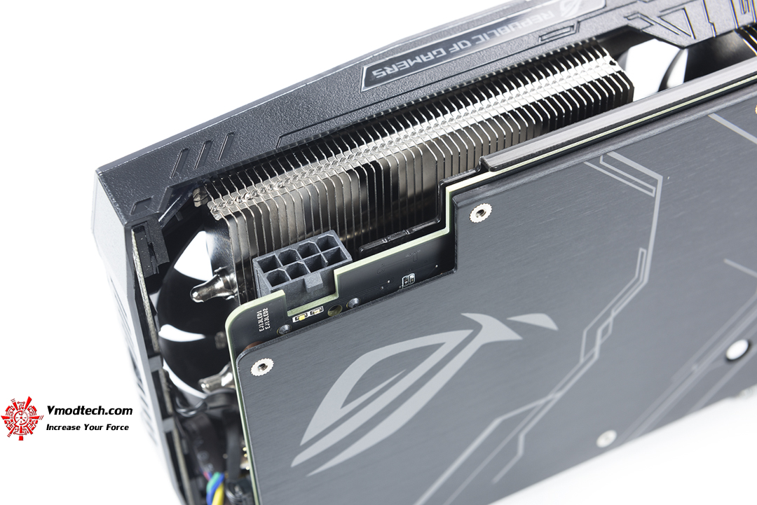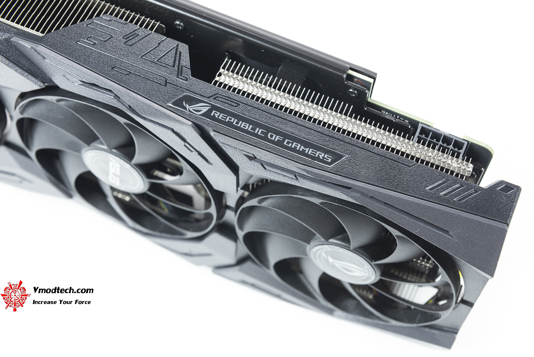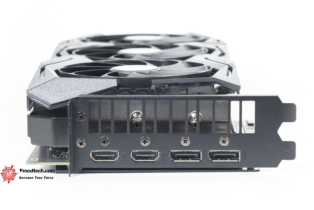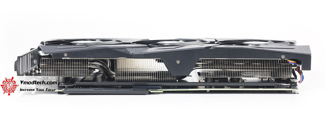ภาพจากมุมนี้จะช่วยให้เห็นร่องของฟินซึ่งค่อนข้างห่าง พิจารณาได้เลยครับว่าลมจากพัดลมสามตัวจะเข้ามาปะทะและดึงเอาความร้อนออกจากฟินและฮีทไปท์ได้อย่างรวดเร็วและแน่นอนครับว่าเสียงจะไม่หวีดจากลมที่รีดผ่านฟินที่เล็กๆด้วย ซึ่งตรงนี้ทำให้การ์ดมีความหนารวมกับฝาครอบฮีทซิ้งค์อยู่ที่ประมาณ 2.7 สล๊อท