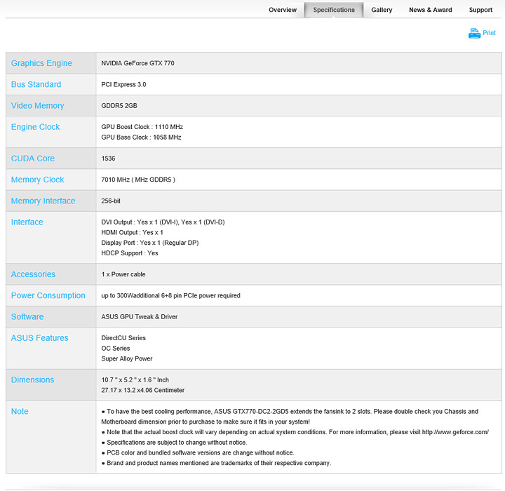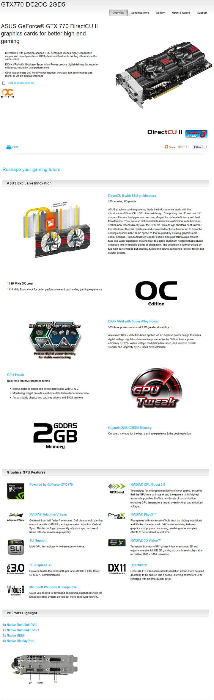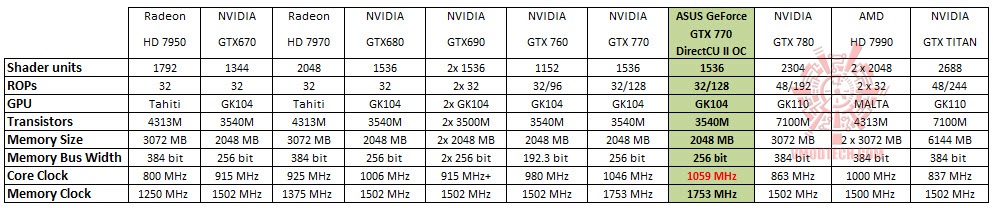จากตารางจะเห็นความแตกต่างระหว่าง NVIDIA GeForce GTX 770 กับ ASUS GeForce GTX 770 DirectCU II OC ได้เป็นอย่างดีในส่วนของคอร์ที่ทาง ASUS ได้ทำการโอเวอร์คล๊อกมาเล็กน้อย