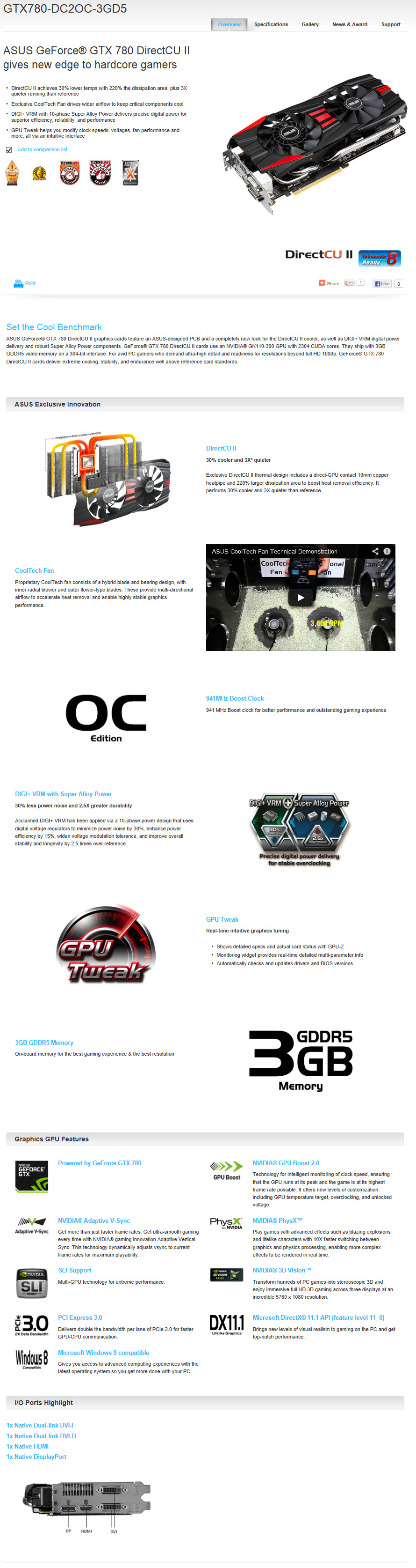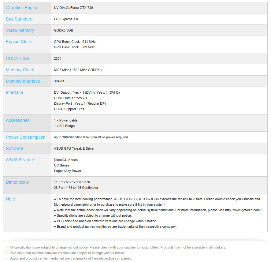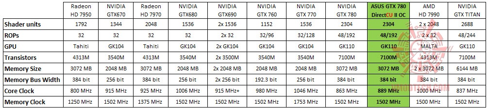 จากตารางจะเห็นความแตกต่างระหว่าง NVIDIA GeForce GTX 780 กับ ASUS GeForce GTX 780 DirectCU II OC ได้เป็นอย่างดีในส่วนของคอร์ที่ทาง ASUS ได้ทำการโอเวอร์คล๊อกมาเล็กน้อย