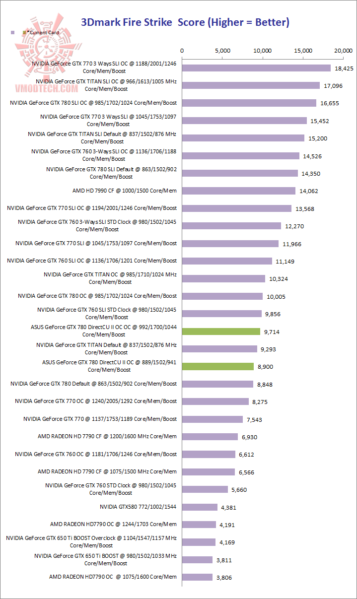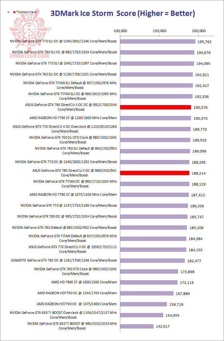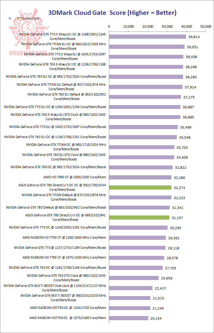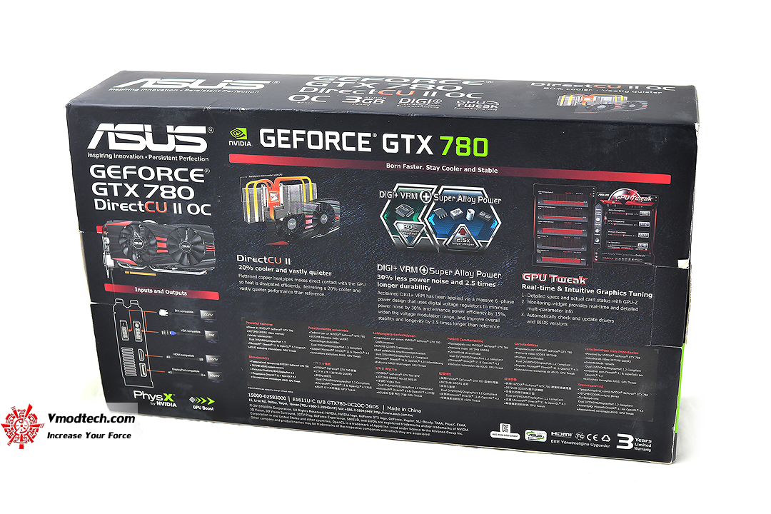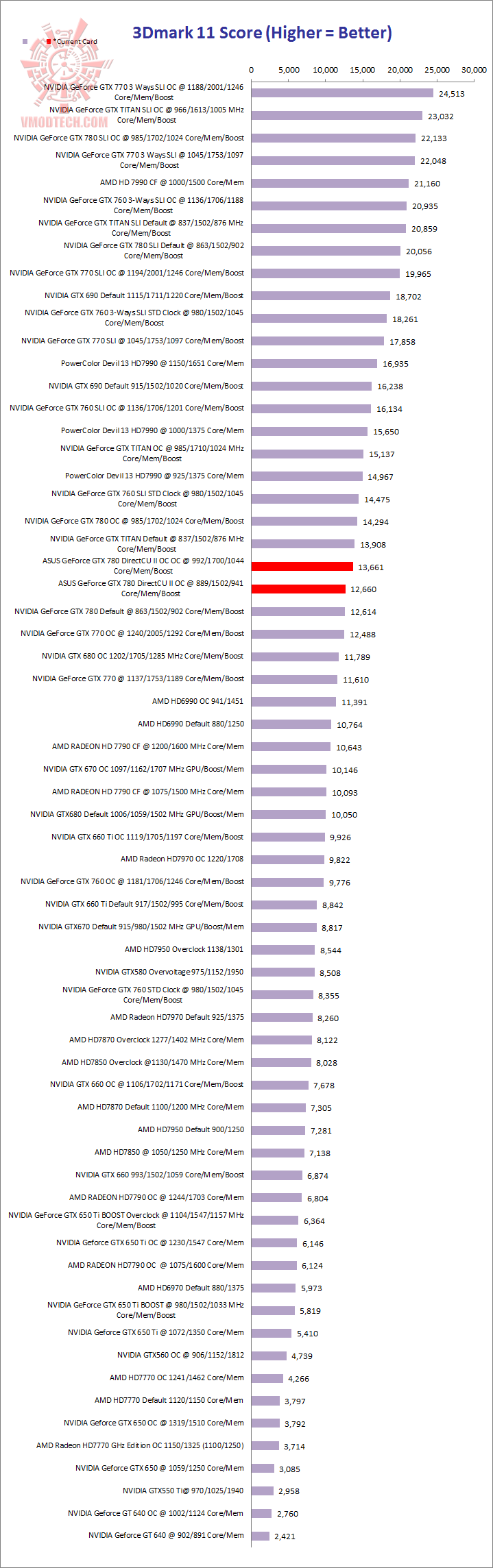 จากตารางจะเห็นความแตกต่างระหว่าง NVIDIA GeForce GTX 780 กับ ASUS GeForce GTX 780 DirectCU II OC ได้เป็นอย่างดีในส่วนของคอร์ที่ทาง ASUS ได้ทำการโอเวอร์คล๊อกมาเล็กน้อย