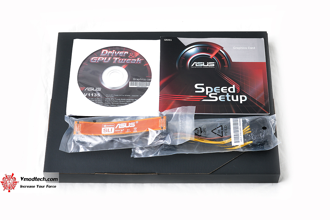 ภายในกล่องที่ได้รับมาก็จะมีอุปกรณ์เท่าที่เห็นนี้ หลักๆก็จะเป็นหัวแปลงไฟจาก PCIe 6 สองหัวเป็น PCIe 8 พินหนึ่งหัวรวมถึงคู่มือ บริดจ์ SLI และแผ่น Driver ครับ