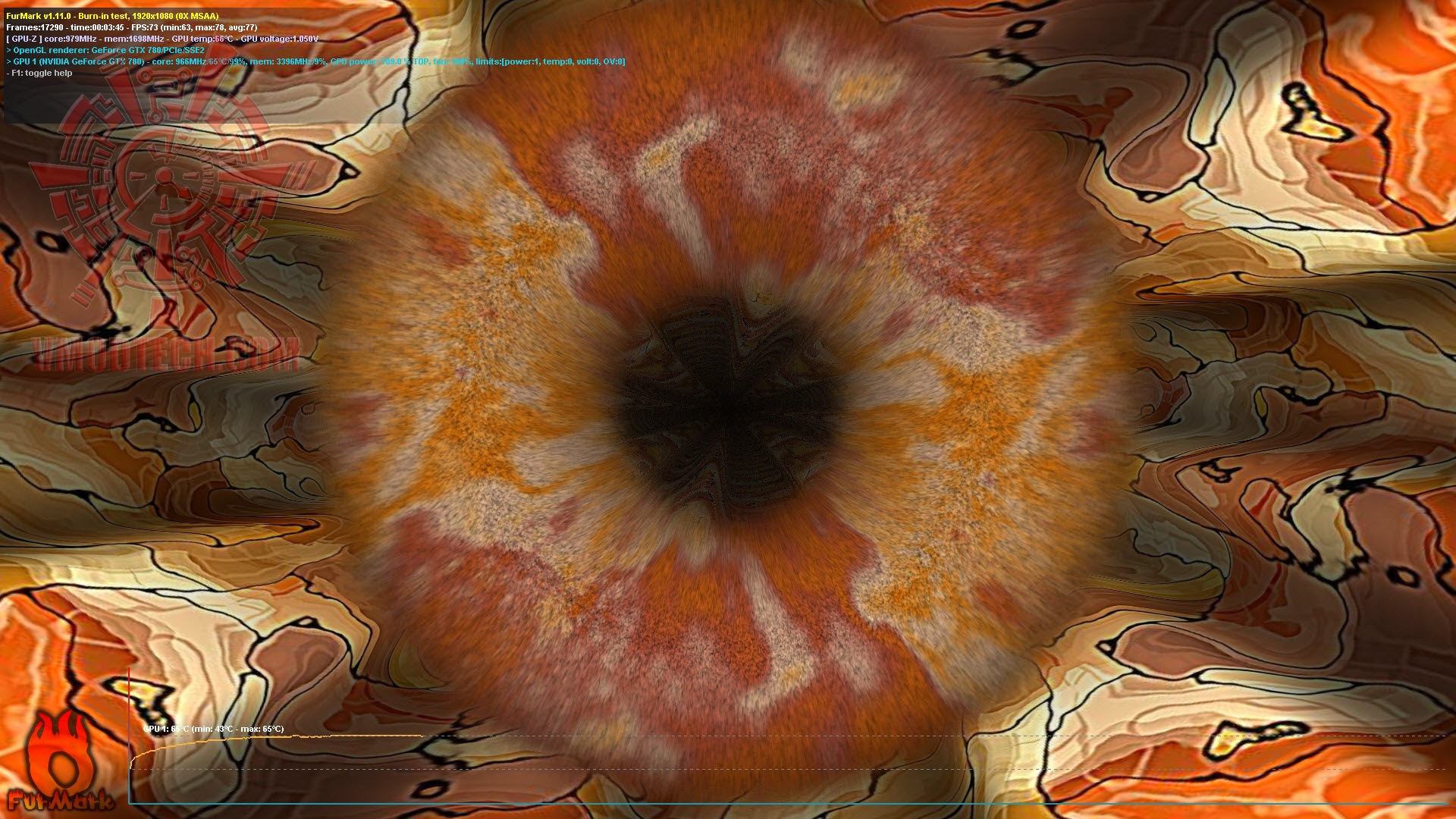 และเมื่อทำการโอเวอร์คล๊อกพร้อมปรับรอบพัดลมไปสุดๆที่ ปรับไฟไปสุดๆ ความร้อนหลังจากทำการเพิ่มไฟและ overclock นั้นอยู่ที่ประมาณ 65 องศาเซลเซียสเท่านั้น เสียงพัดลมเบามากแม้ว่าผมจะเซตไว้ที่ร้อยเปอร์เซนต์