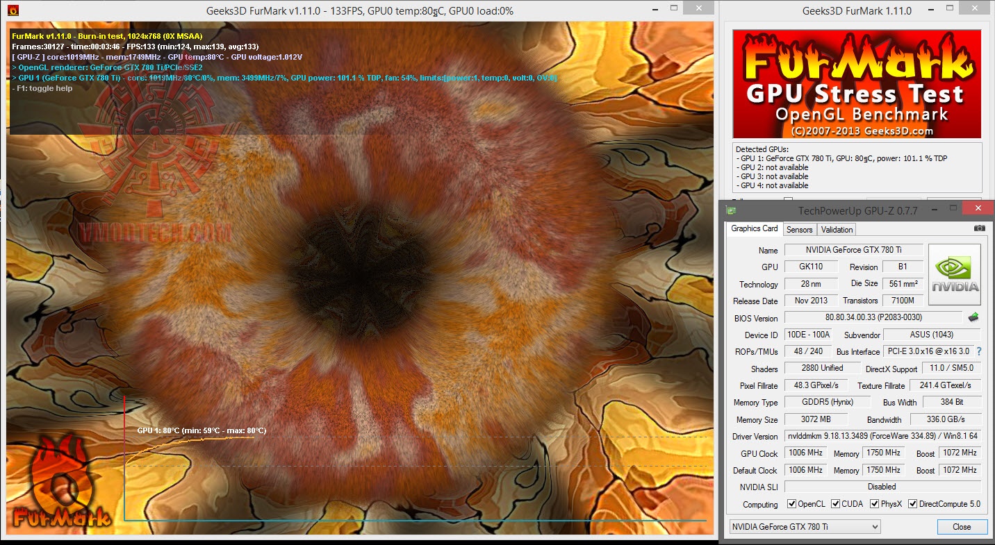 อุณหภูมิของการ์ดขณะ Furmark นั้นจะอยู่ที่ไม่เกิน 80 องศา รอบพัดลมออโต้เบาๆที่ 54 เปอร์เซนต์ตามโหมดการทำงานปกติ