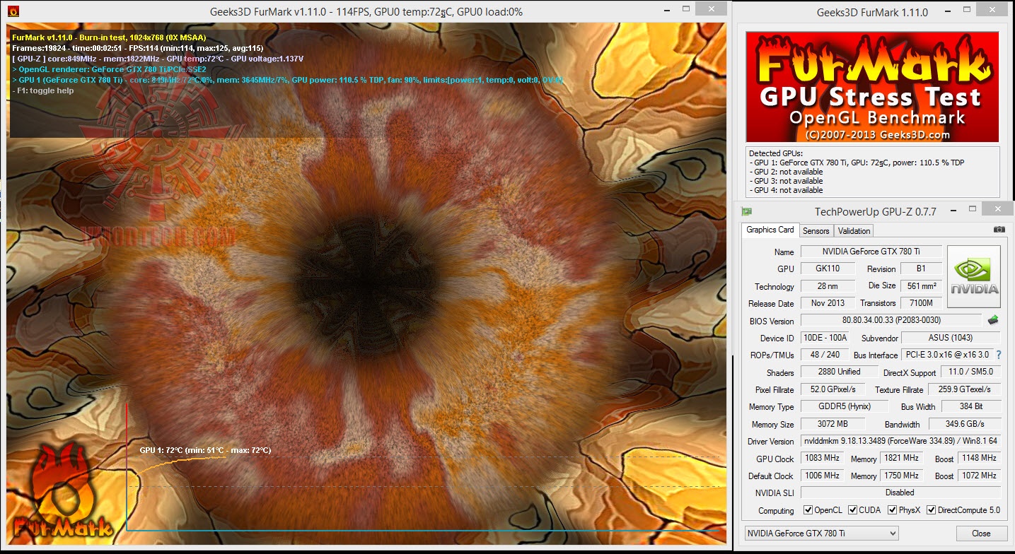 ความเร็วมาตรฐานของ ASUS GeForce GTX 780 Ti MATRIX PLATINUM นั้นได้ถูกโอเวอร์คล๊อกมาจากค่ามาตรฐานของ Nvidia ที่ 1006/1750/1072 MHz Core/Mem/Boost แรงตั้งแต่แกะกล่องอีกแล้ว