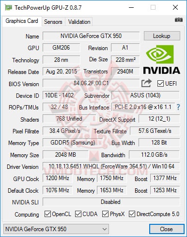 ASUS GeForce GTX 950 OC @ 1200/1753/1377 MHz Core/Mem/Boost