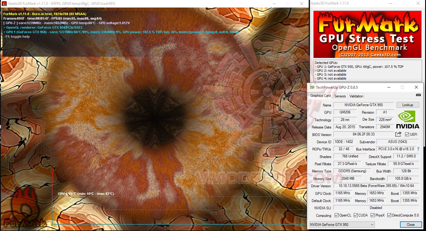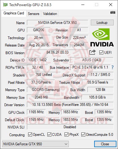 ASUS GeForce GTX 950 STRIX GAMING @ 1165/1653/1355 MHz Core/Mem/Boost