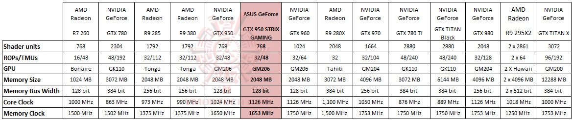 ตารางเปรียบเทียบ ASUS GeForce GTX 950 STRIX GAMING 2GB GDDR5 กับการ์ดในยุคปัจจุบัน