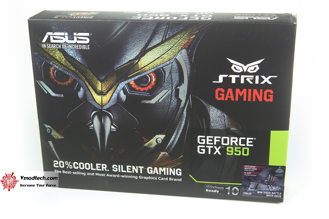กล่องของ ASUS GeForce GTX 950 STRIX GAMING นั้นจะเป็นกล่องที่ออกมาเพื่อเป็นเอกลักษณ์ของซีรีย์ STRIX เป๊ะ