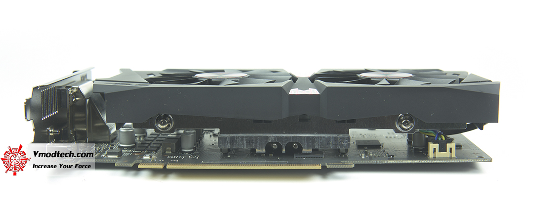 ที่ด้านซ้ายของรูปนั้นจะเป็นจุดเชื่อมต่อ SLI ซึ่งสามารถต่อการ์ดเพิ่มได้อีกหนึ่งใบครับ ส่วนด้านขวามือจะเป็นจุดต่อไฟเลี้ยงการ์ดที่ต้องการหกพินหนึ่งหัว และที่พิเศษคือ ตัวการ์ด ASUS GeForce GTX 950 STRIX GAMING นั้นได้ติดตั้งคานยึดกันแอ่นมาให้ด้วยครับ ก็สวยดี
