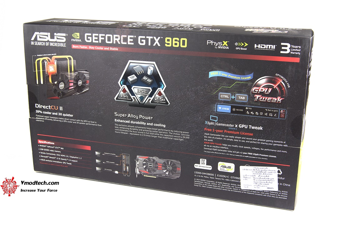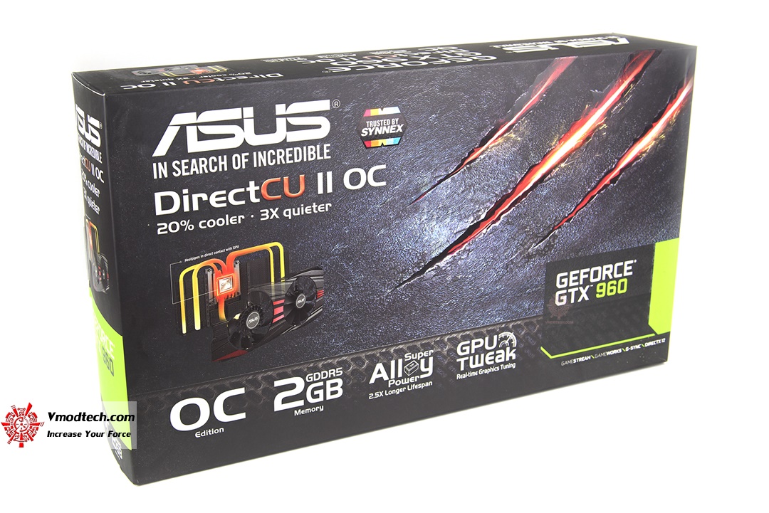 สวัสดีครับทุกๆท่านที่เยี่ยมชมเว็บไซต์ Vmodtech.com วันนี้เรามีกราฟฟิกการ์ดรุ่นกลางที่น่าจะเป็นระดับที่หลายๆคนพอจะจับจองเป็นเจ้าของได้ไม่ยากนักมารีวิวให้ได้ชมกัน สำหรับ ASUS GeForce GTX 960 DirectCU II OC นั้นต้องถือว่าเป็นกราฟฟิกการ์ดที่ใช้ GPU รุ่นยอดนิยมมาเสริมแต่งชุดระบายความร้อน DirectCU II และเพิ่มความเร็วให้กับการ์ดมาขึ้นกว่าการ์ดมาตรฐานจาก NVIDIA เพื่อให้นักเล่นเกมส์ได้เพลินไปกับการเล่นเกมส์โดยไม่ต้องมาทำการโอเวอร์คล๊อกเองครับ สำหรับรายละเอียดต่างๆของตัวการ์ดจากหน้าเว็บไซด์ของ ASUS นั้นสามารถติดตามได้จากด้านล่างนี้เลย
