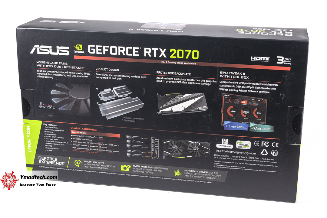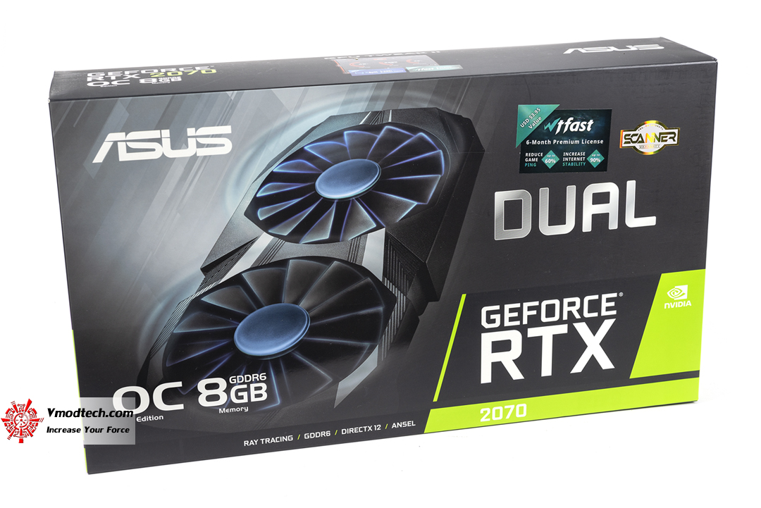 กล่องบรรจุของ ASUS GeForce RTX 2070 DUAL นั้นมาพร้อมกับแพกเกจที่ถูกออกแบบภาพด้านหน้ากล่องสวยงามด้วยโครงสร้างของชุดระบายความร้อนที่มีพัดลมคู่ รายละเอียดและเทคโนโลยีต่างๆของการ์ดถูกอัดแน่นไว้ด้านหลัง